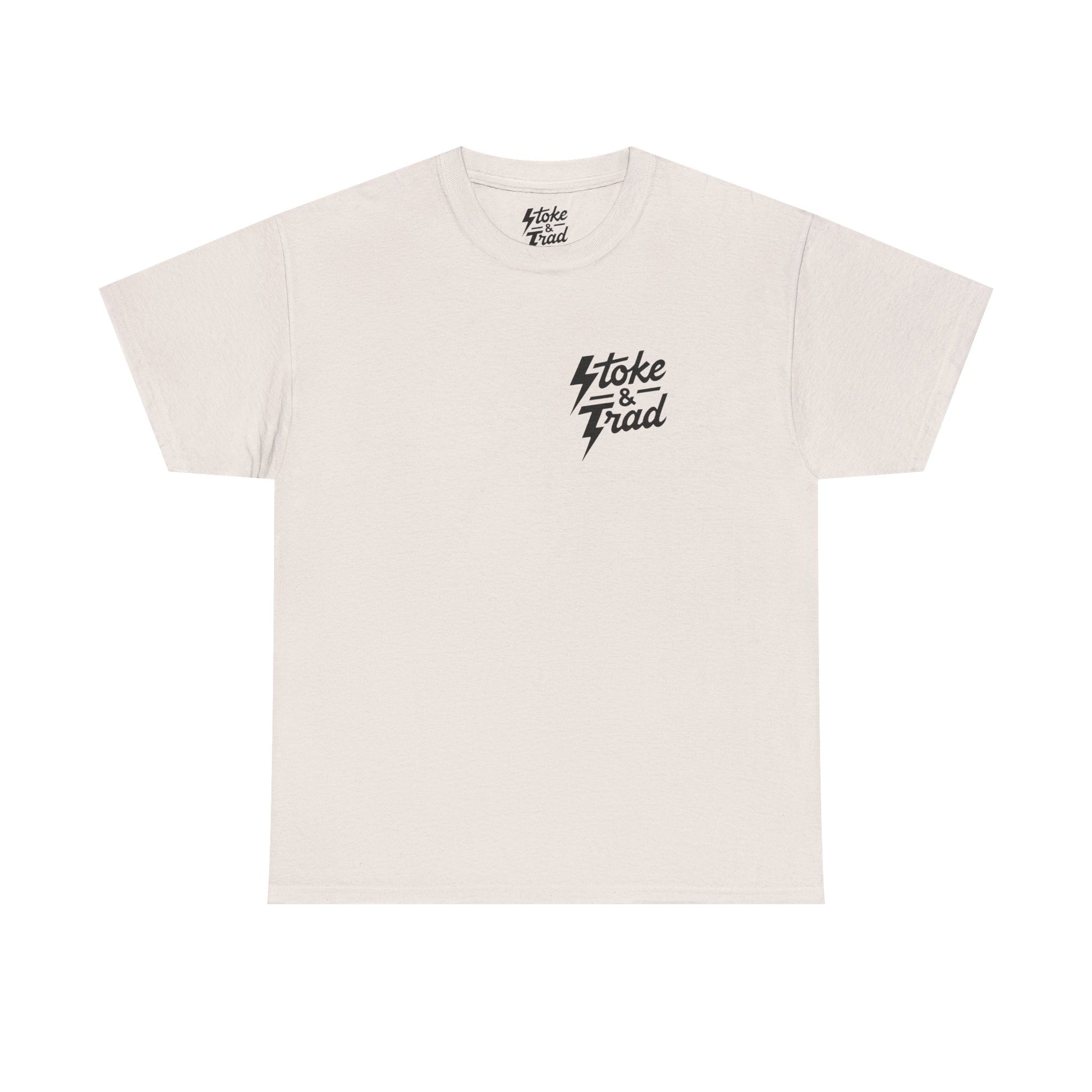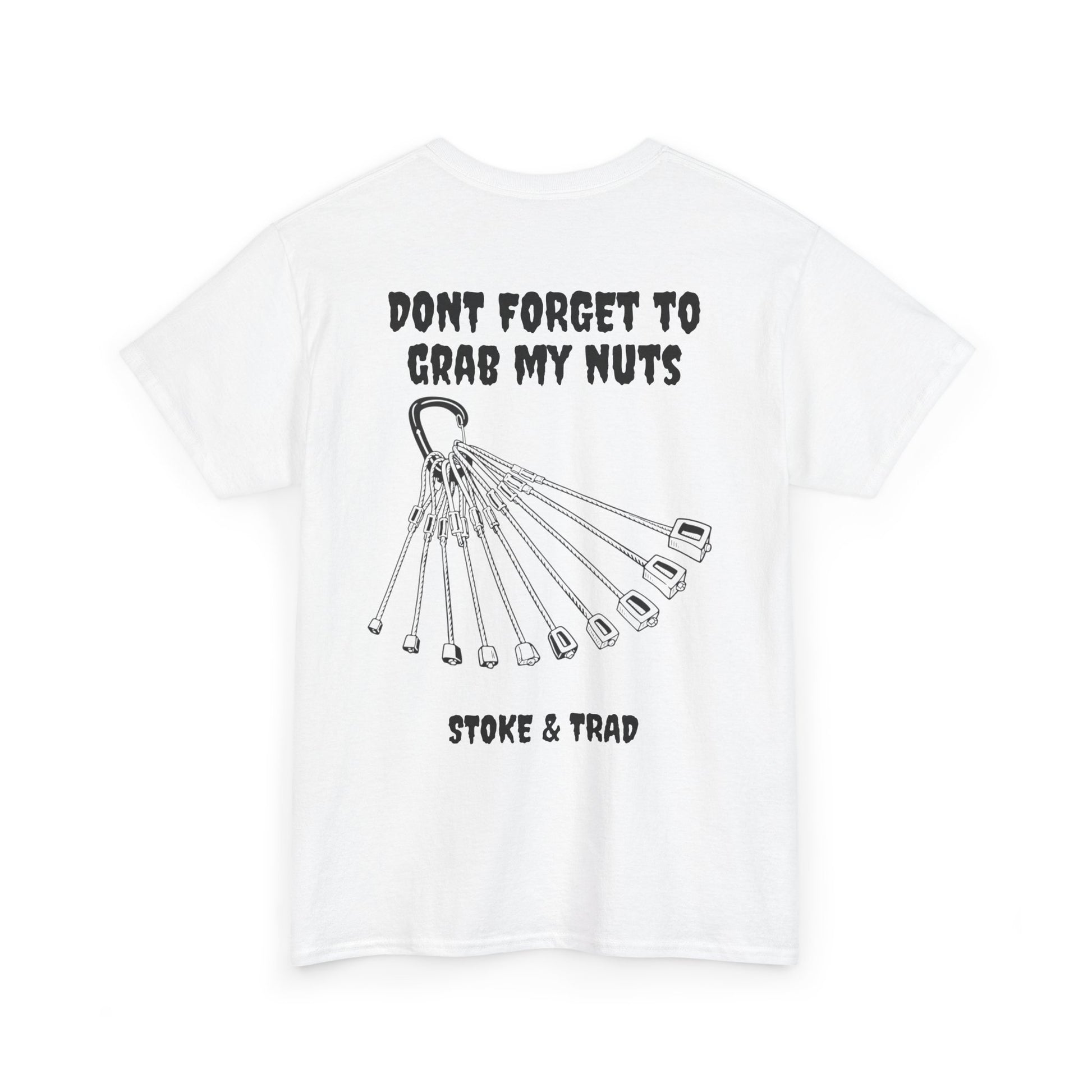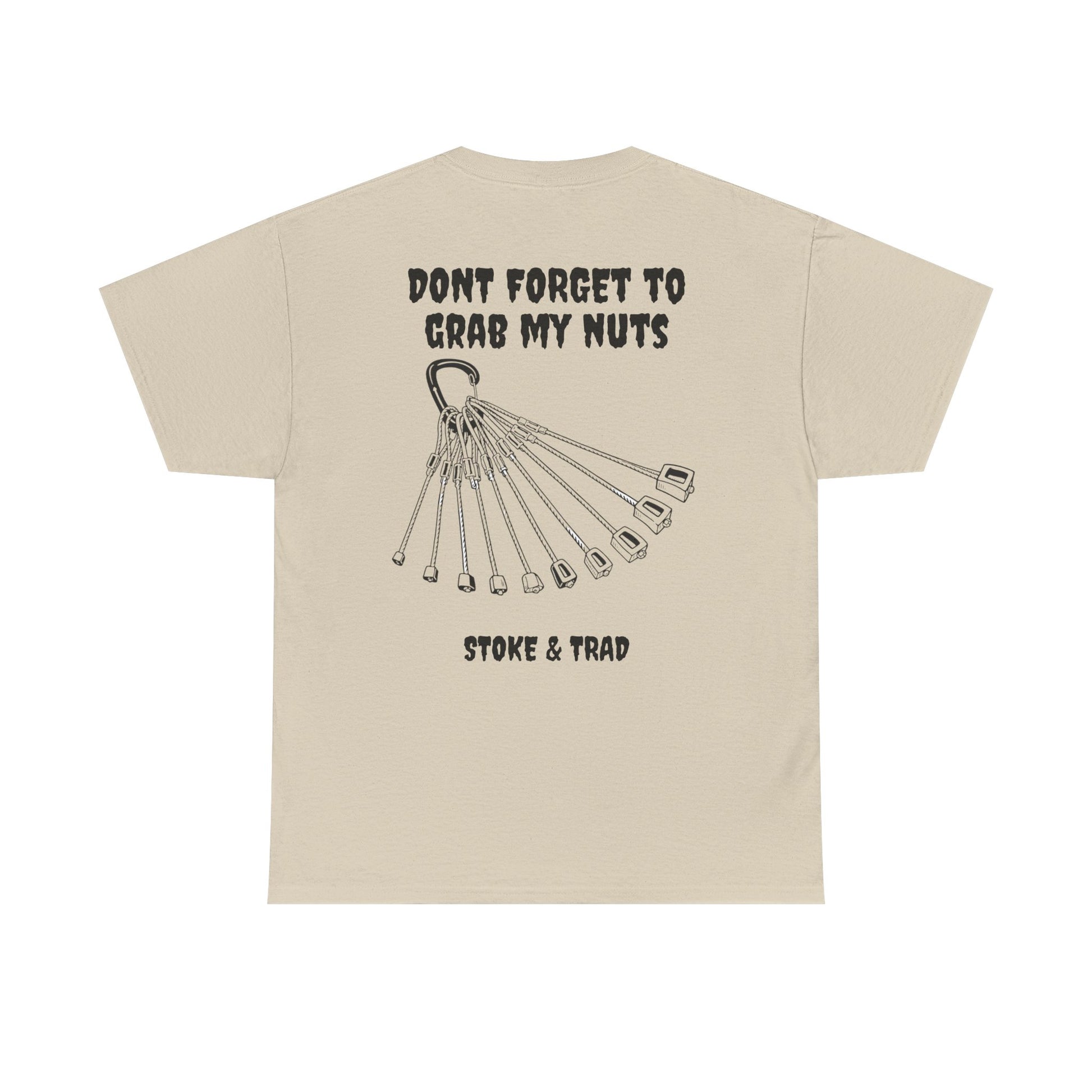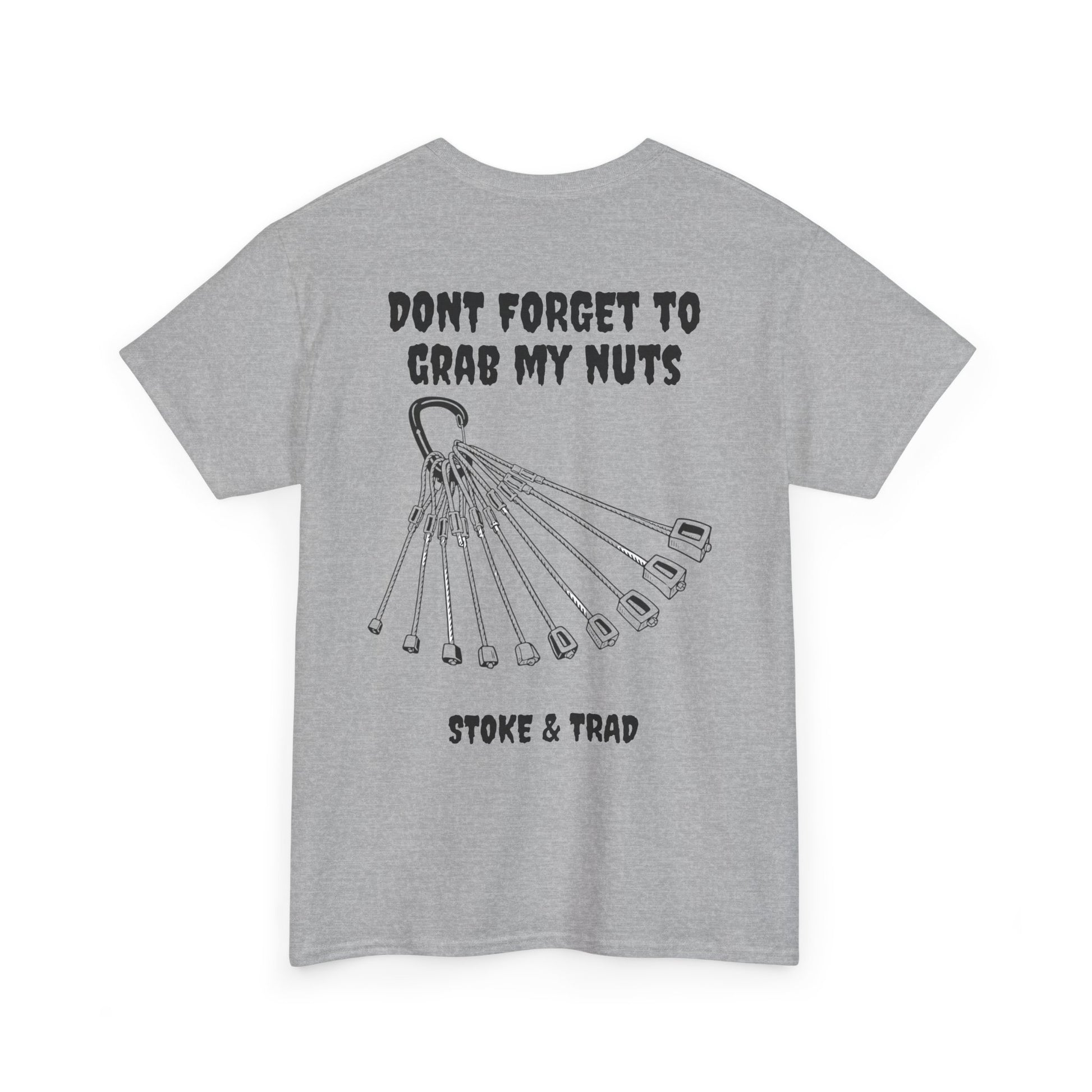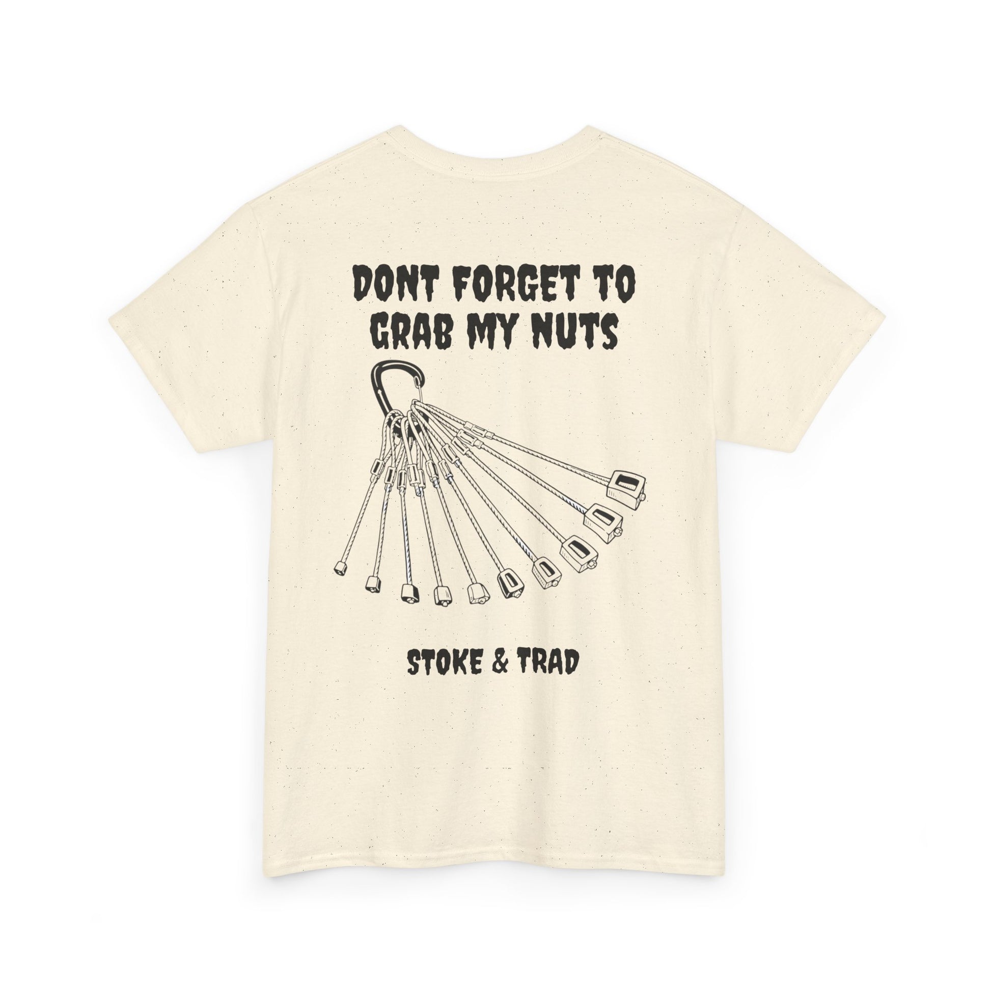 This classic crew tee celebrates the climb. The front bears a “Stoke & Trad” logo and bold back artwork shows a rock of nuts with the words "don't forget to grab my nuts" . Wear it to your moms house, the petting zoo, or go-cart racing. The fit sits relaxed at the shoulders and chest. The soft and smooth cotton keeps you comfortable whether you’re chalking up or grabbing a coffee after a send.