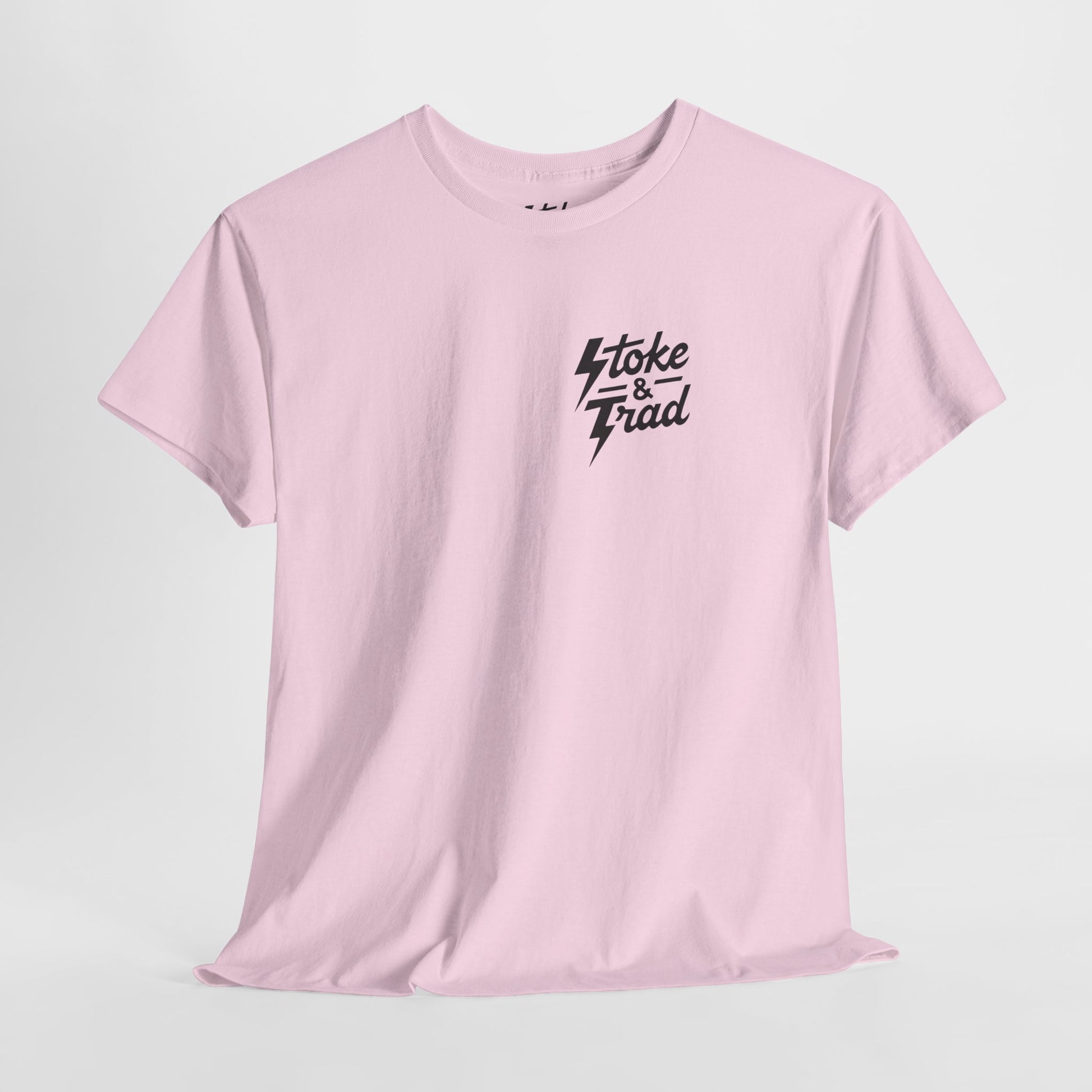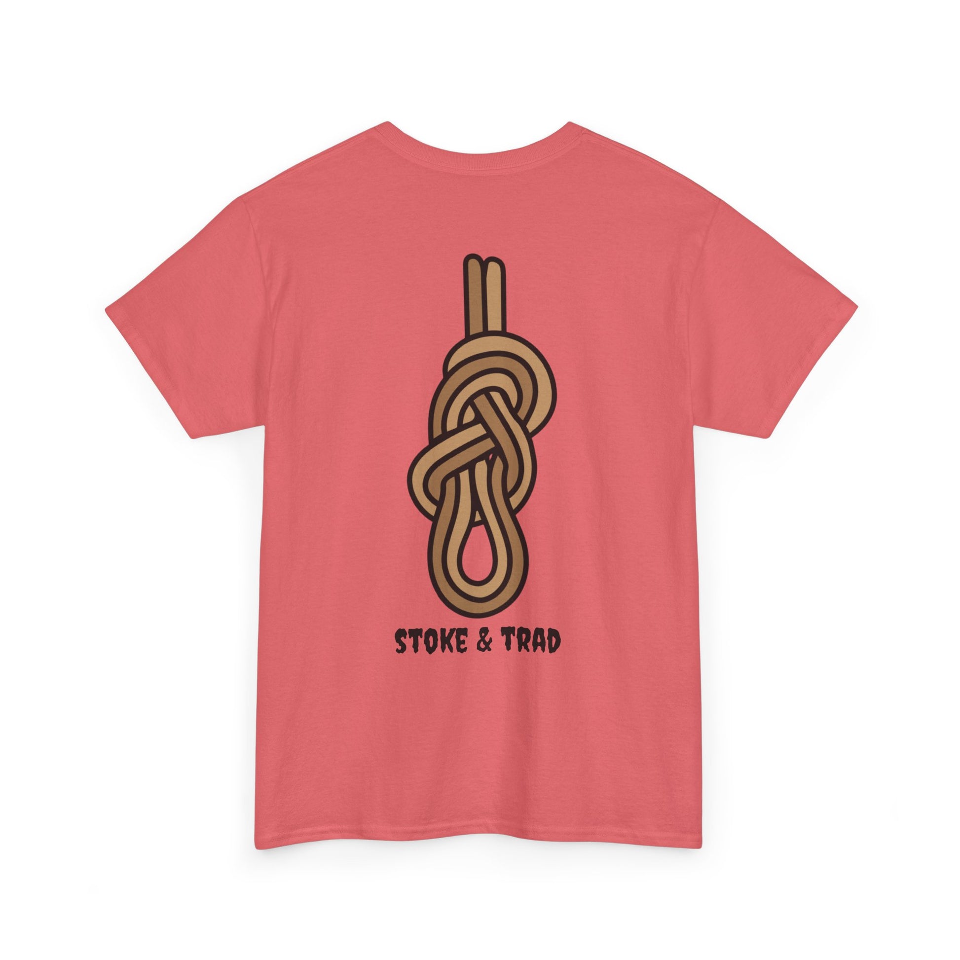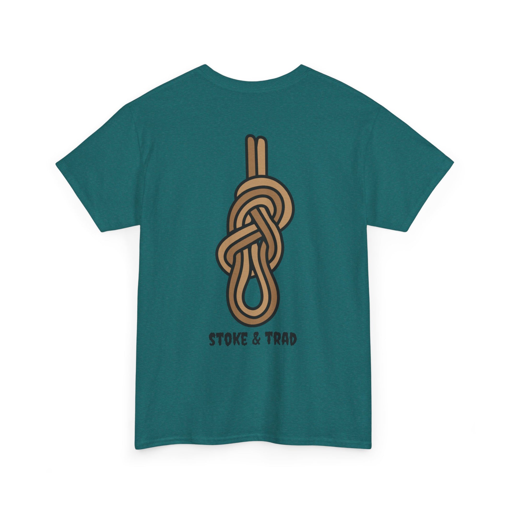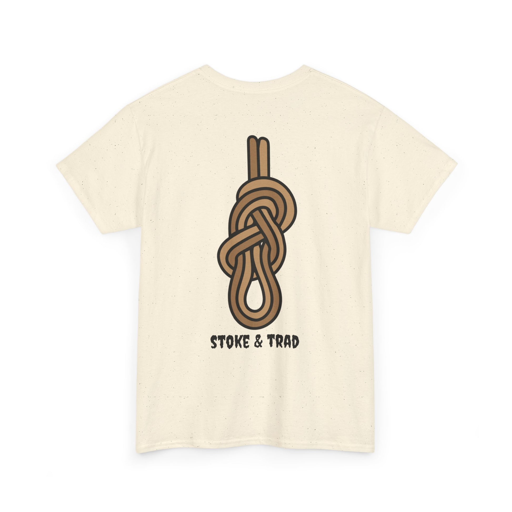 This classic crew tee celebrates the climb. The front bears a “Stoke & Trad” logo and bold back artwork shows a rope tied into a figure 8. Wear it building anchors, at the train station, or chess club. The fit sits relaxed at the shoulders and chest. The soft and smooth cotton keeps you comfortable whether you’re chalking up or grabbing a coffee after a send.