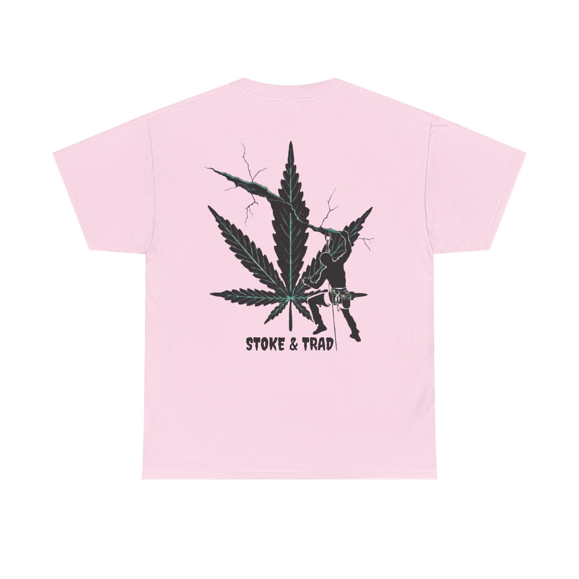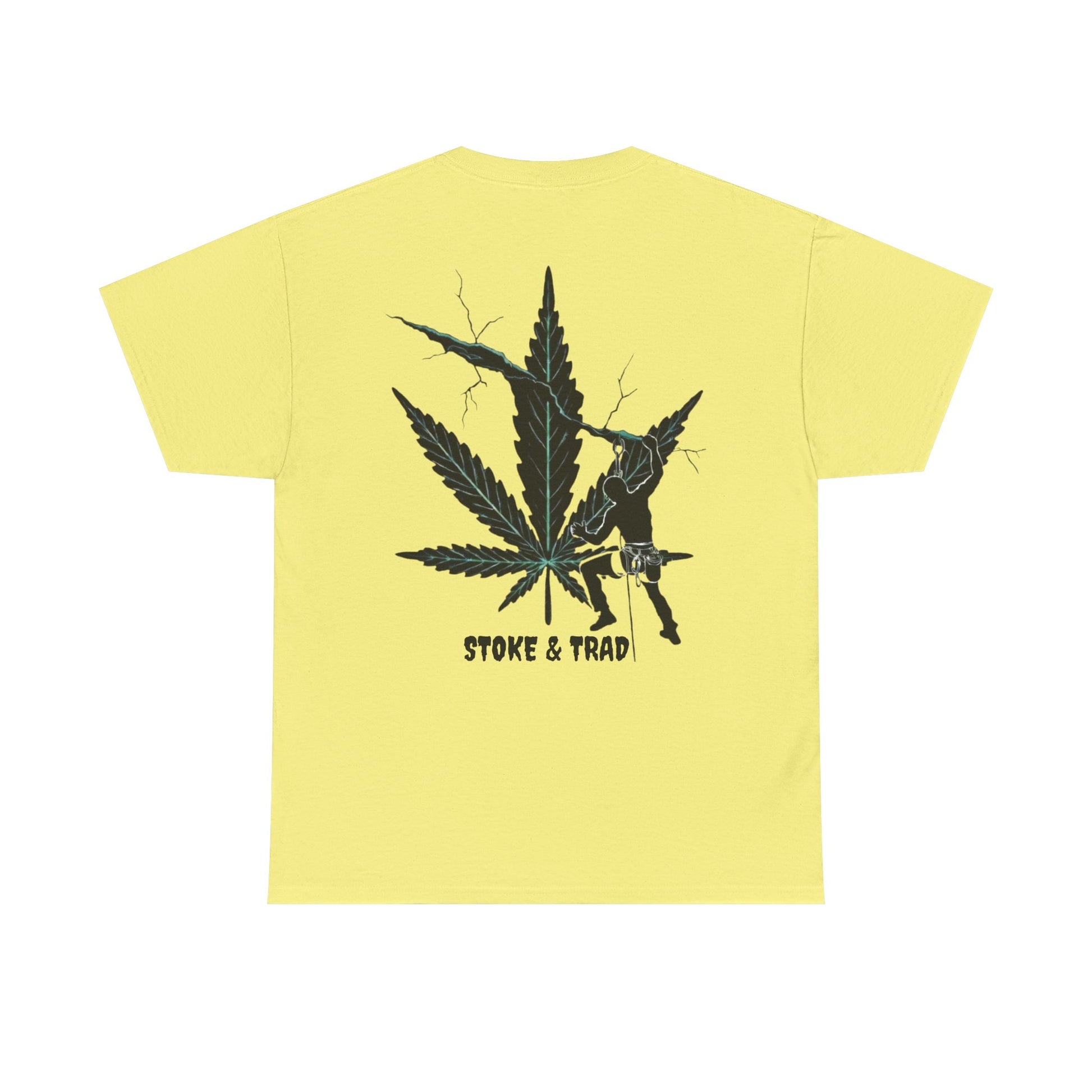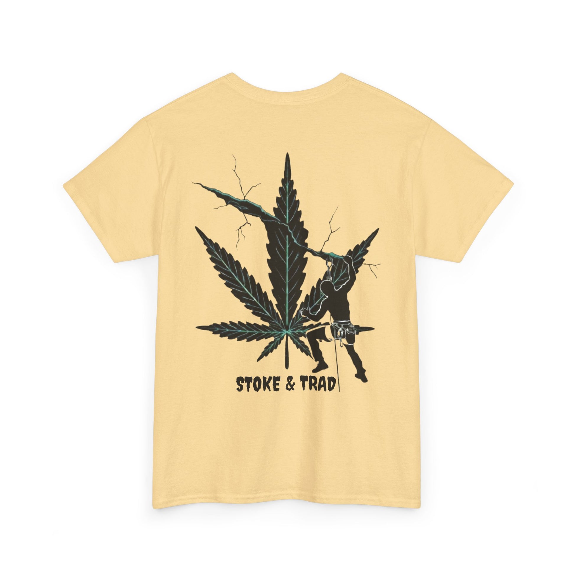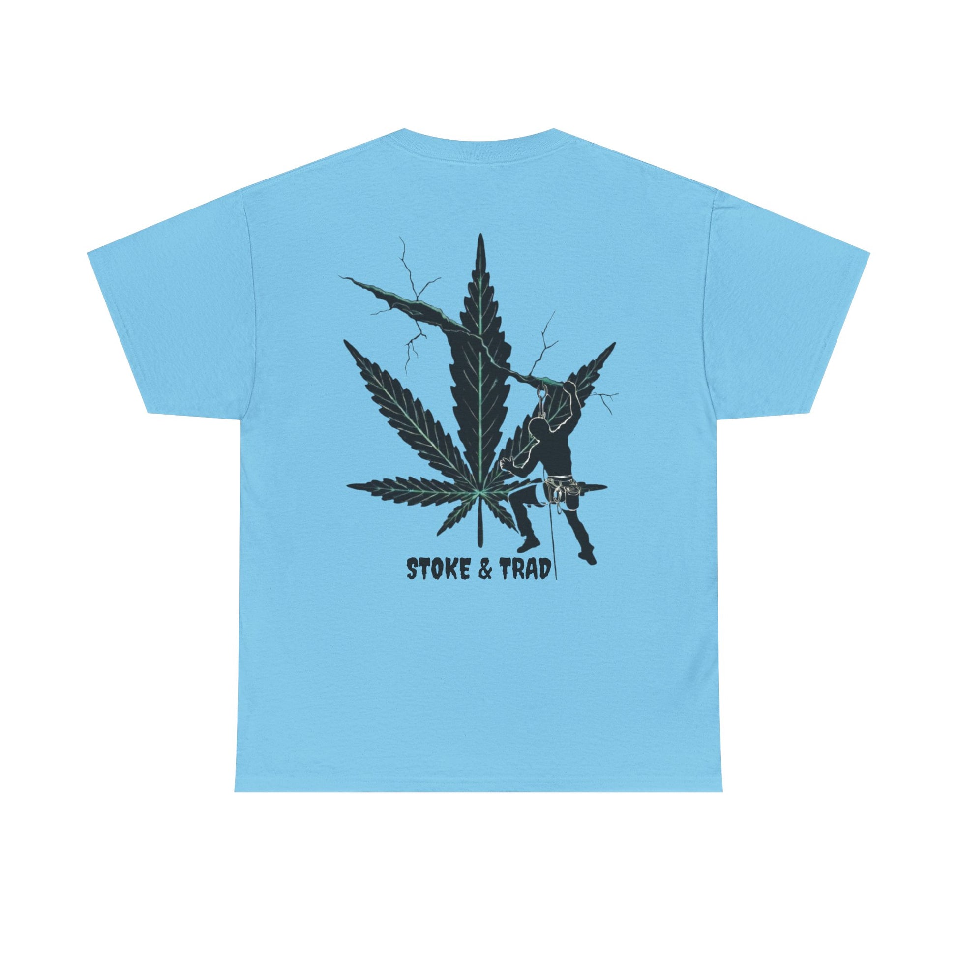This classic crew tee celebrates the climb. The front bears a “Stoke & Trad” logo and bold back artwork shows a climber climbing crack with hemp leaf in background. Wear it trad climbing, belay-side chats, or bouldering. The fit sits relaxed at the shoulders and chest. The soft and smooth cotton keeps you comfortable whether you’re chalking up or grabbing a coffee after a send.