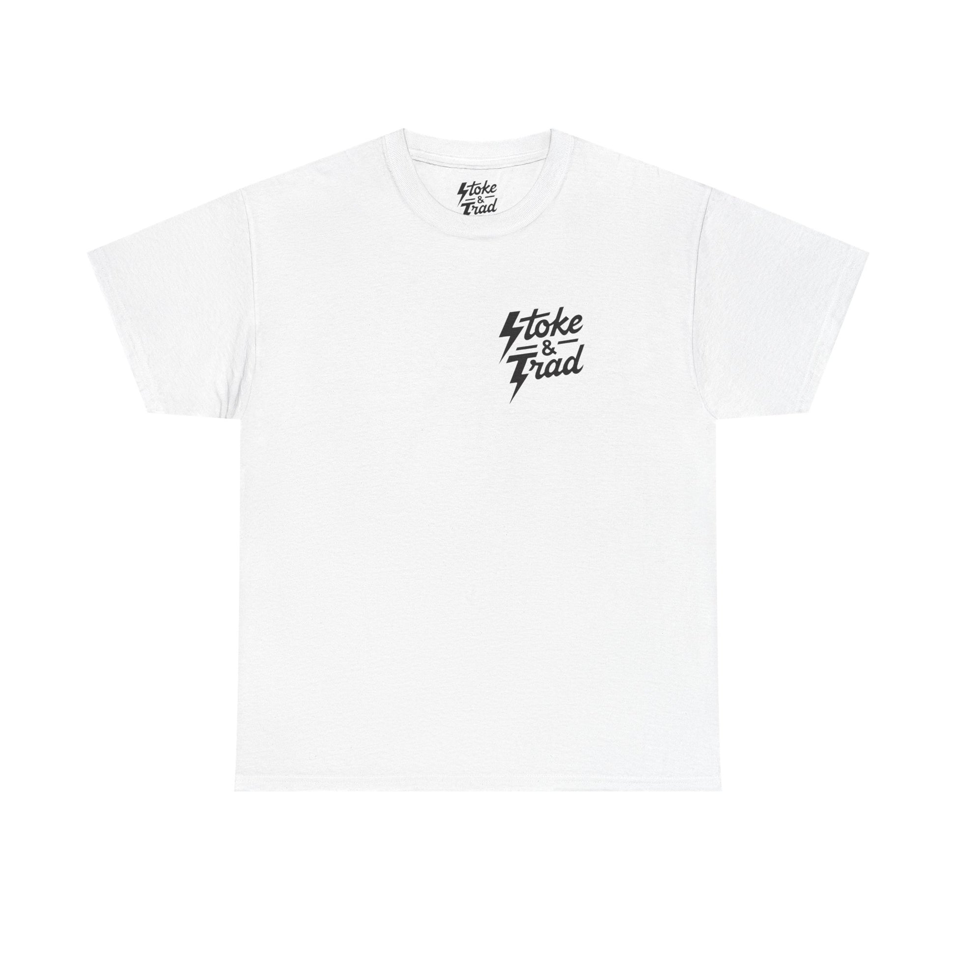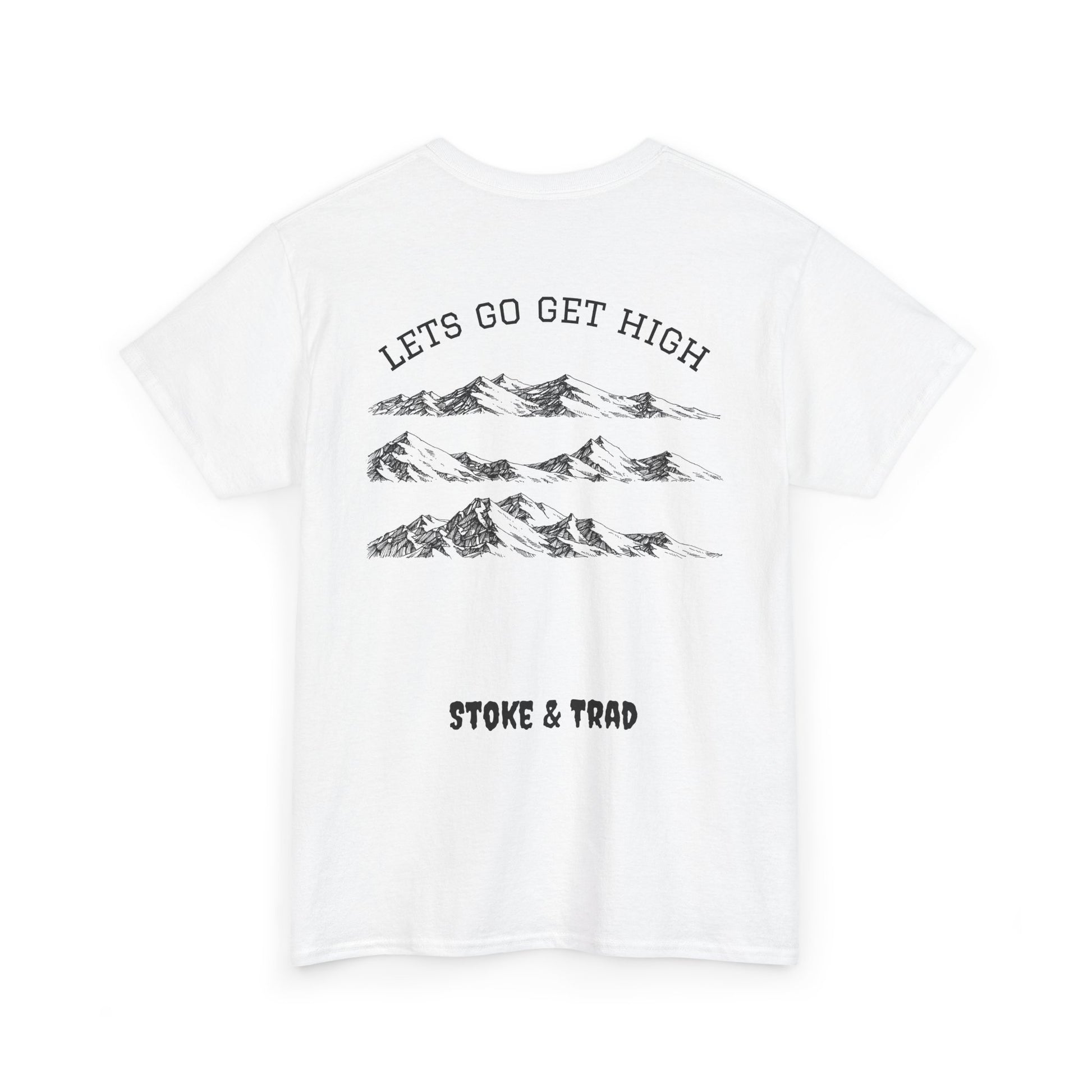 This classic crew tee celebrates the climb. The front bears a “Stoke & Trad” logo and bold back artwork shows mountain peaks and the words "lets go get high". Wear it high in the mountains, high in the mountains, or high in the mountains. The fit sits relaxed at the shoulders and chest. The soft and smooth cotton keeps you comfortable whether you’re chalking up or grabbing a coffee after a send.