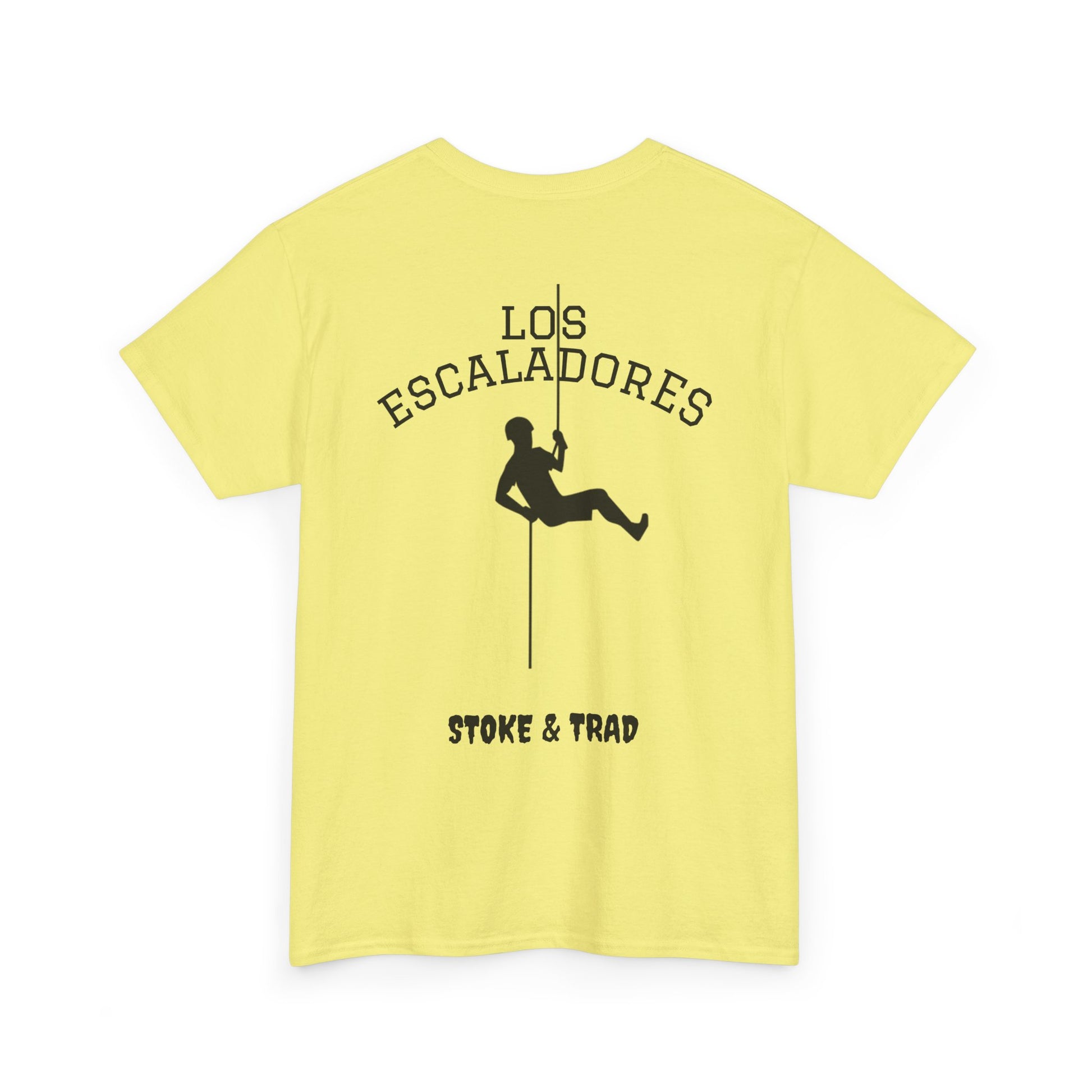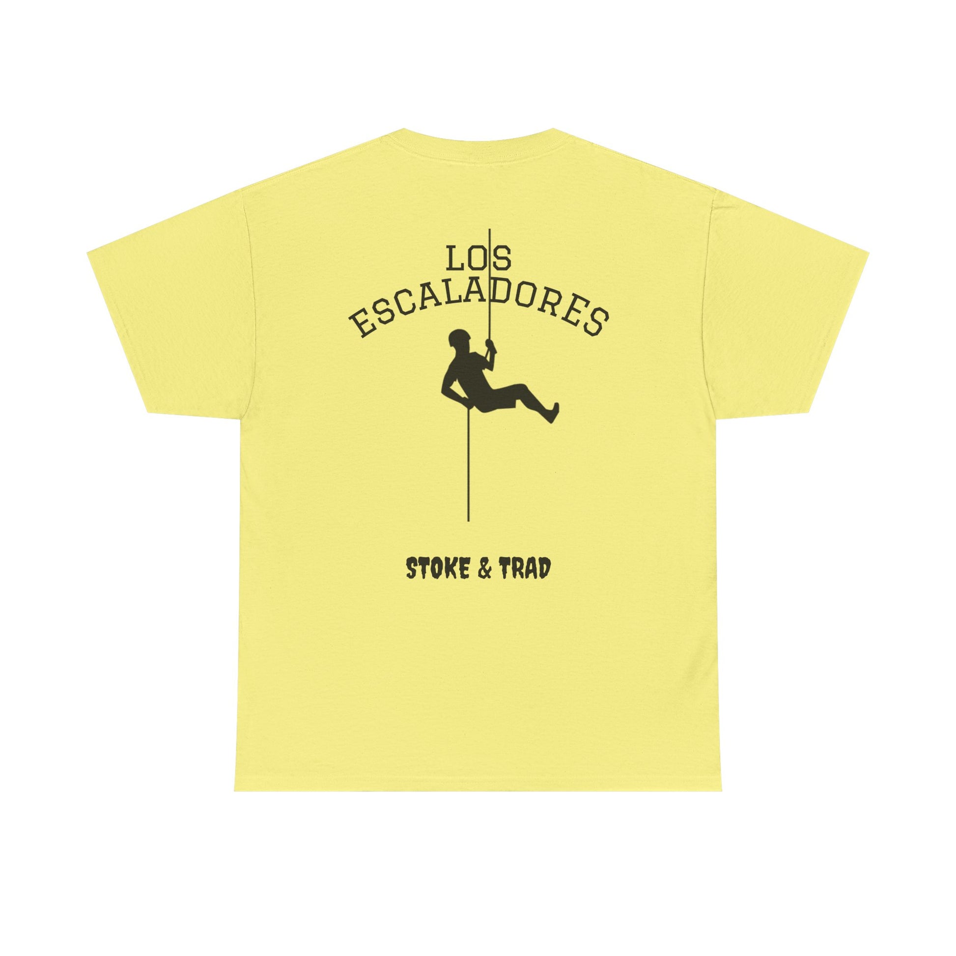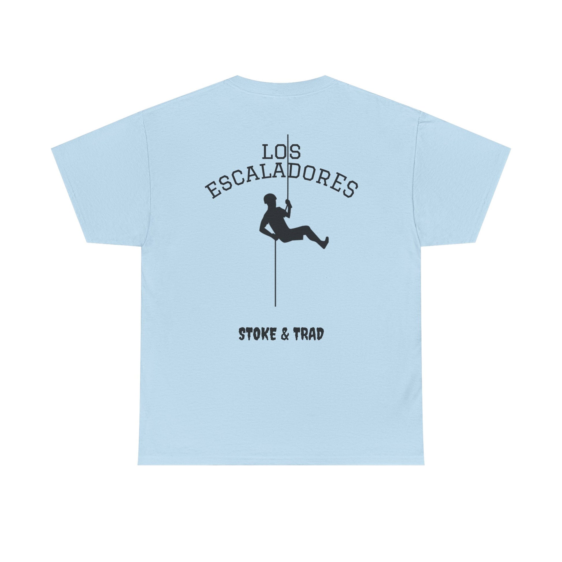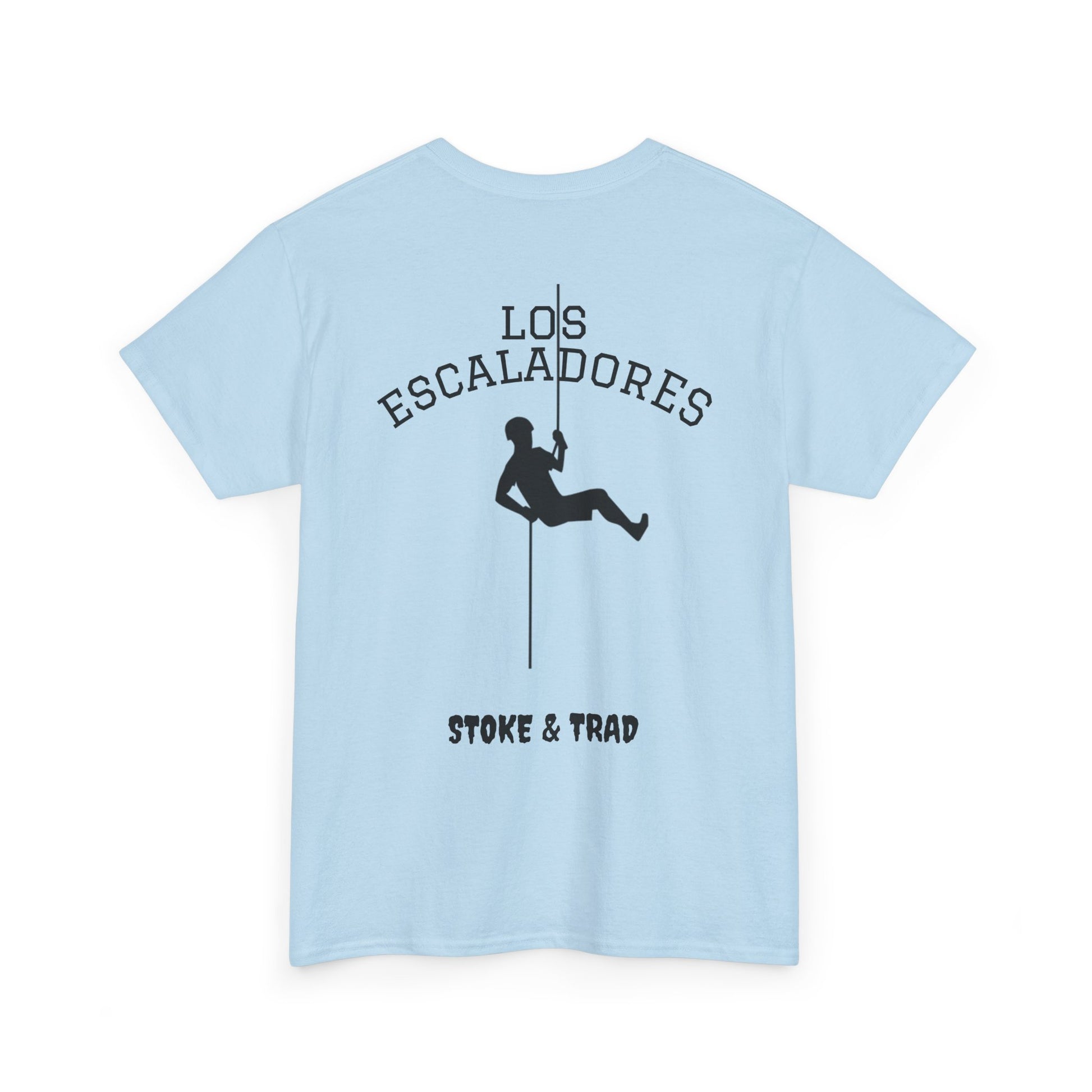 This classic crew tee celebrates the climb. The front bears a “Stoke & Trad” logo and bold back artwork shows a climber lowering and the words "Los Escaladores". Wear it rapping, bedside chats, or to the carnival. The fit sits relaxed at the shoulders and chest. The soft and smooth cotton keeps you comfortable whether you’re chalking up or grabbing a coffee after a send.