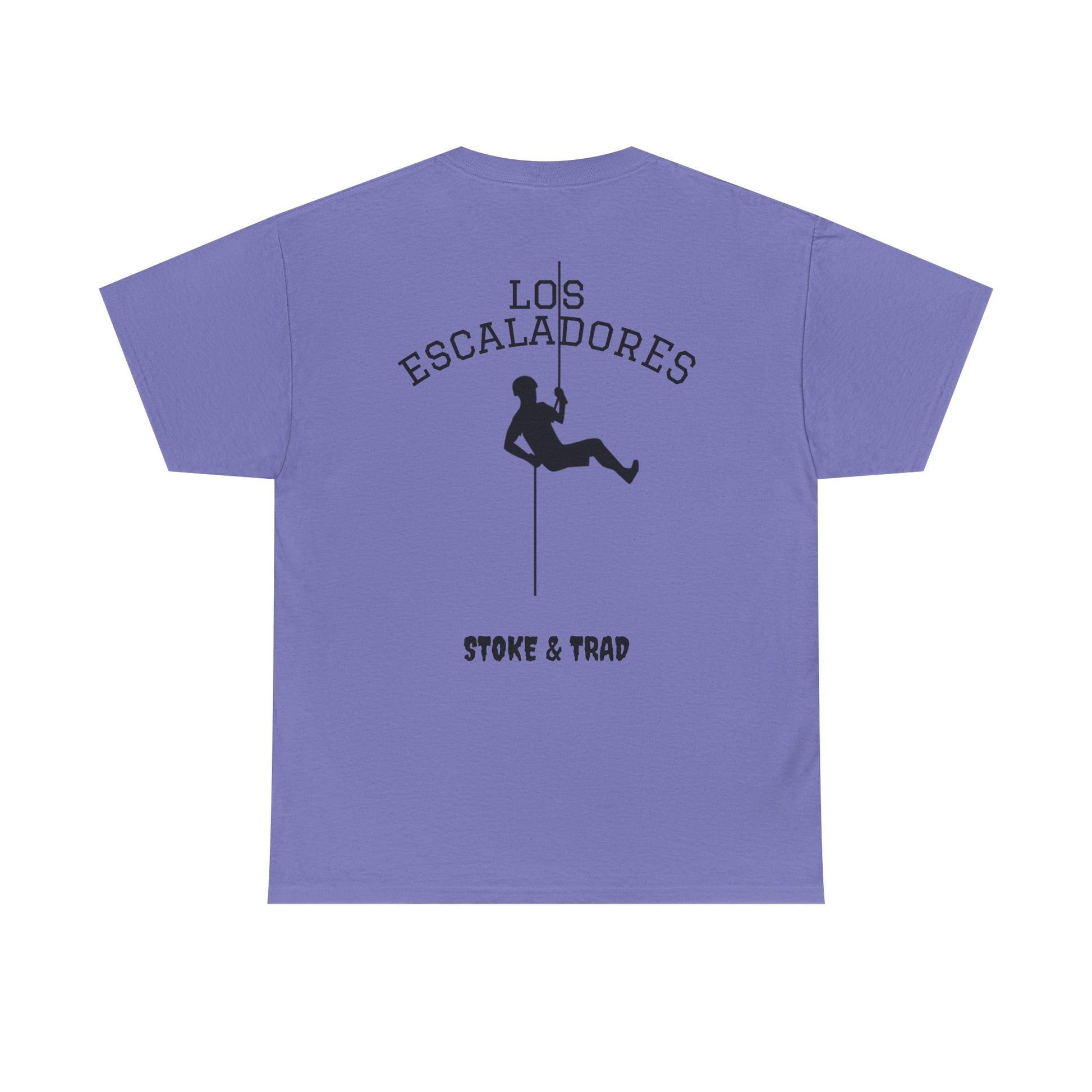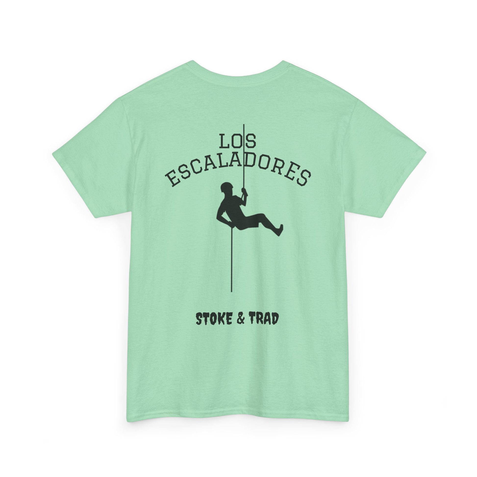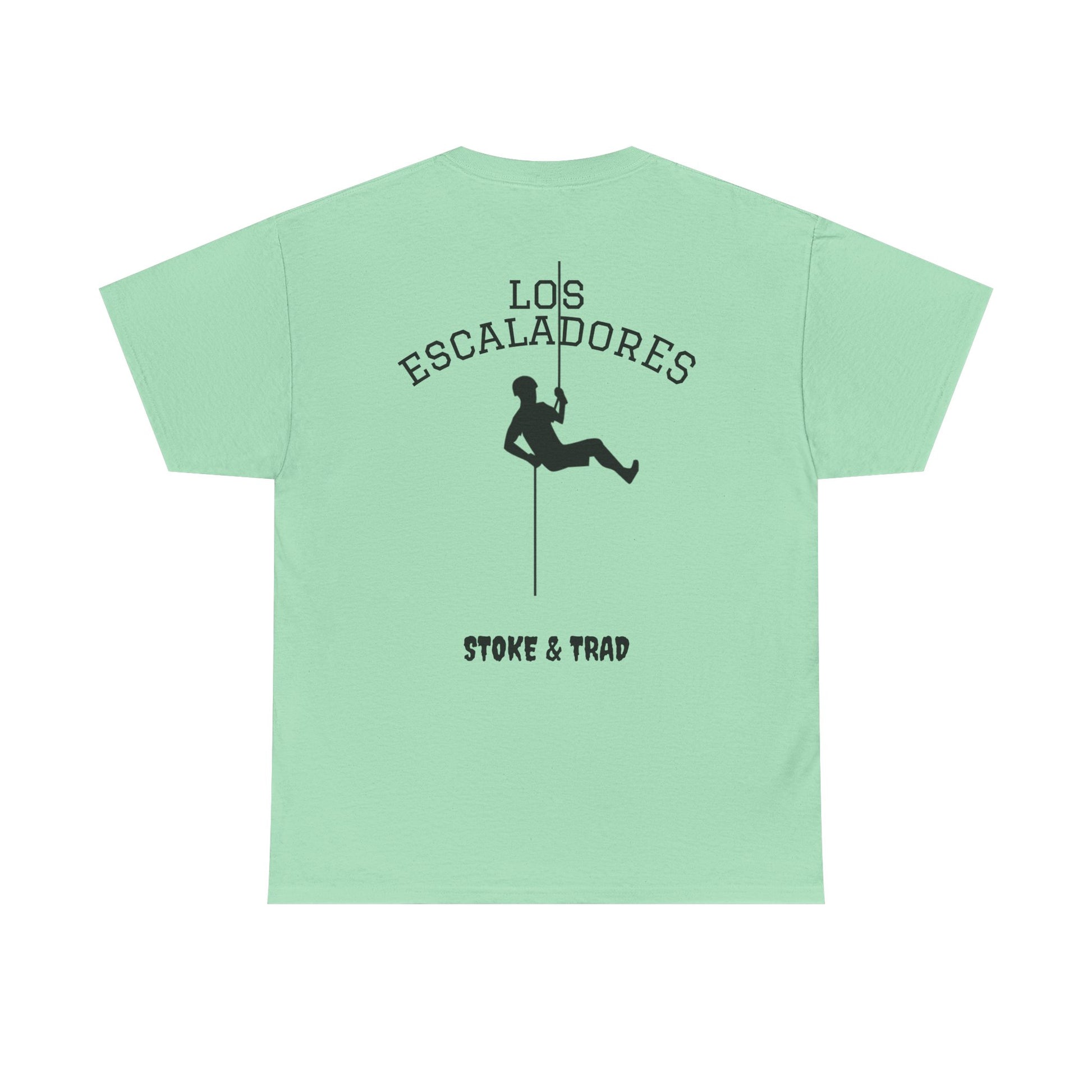 This classic crew tee celebrates the climb. The front bears a “Stoke & Trad” logo and bold back artwork shows a climber lowering and the words "Los Escaladores". Wear it rapping, bedside chats, or to the carnival. The fit sits relaxed at the shoulders and chest. The soft and smooth cotton keeps you comfortable whether you’re chalking up or grabbing a coffee after a send.