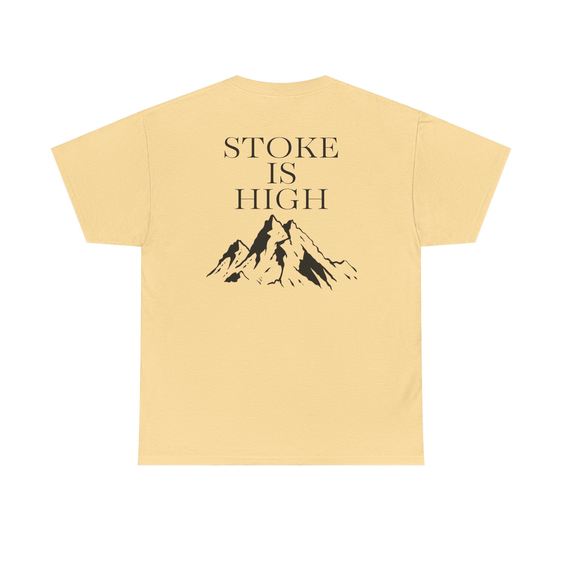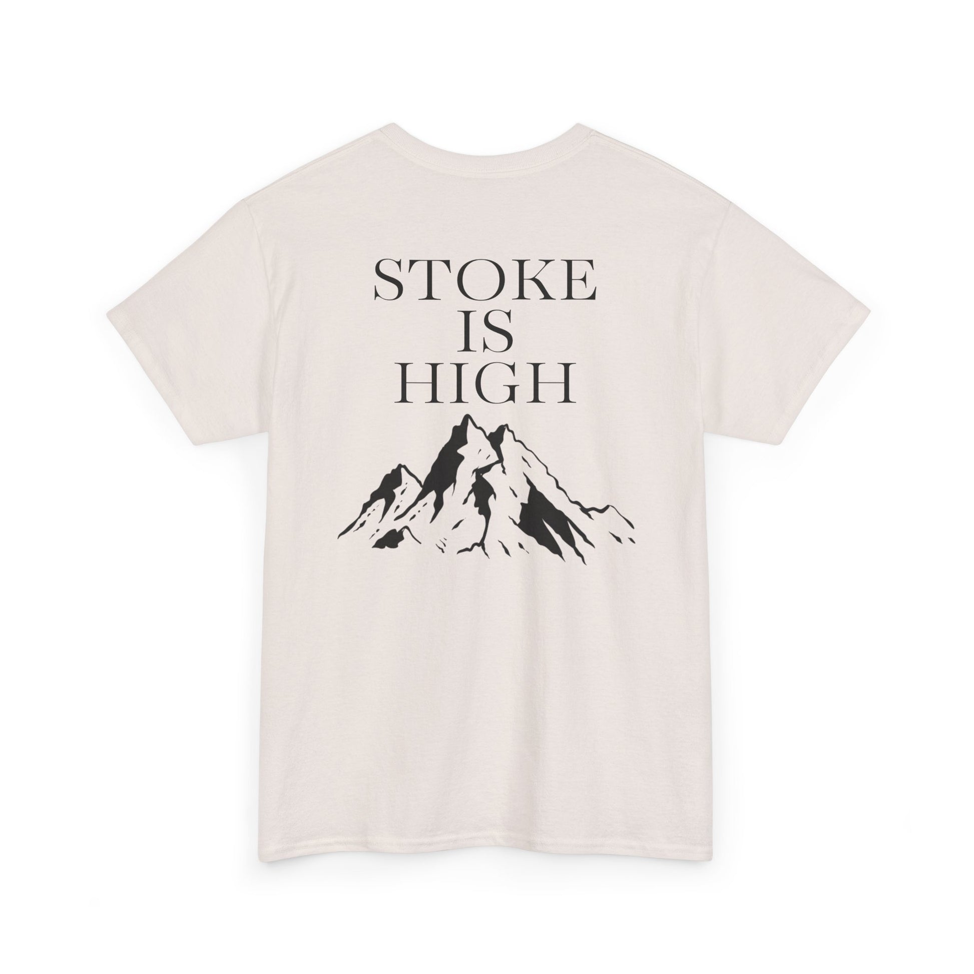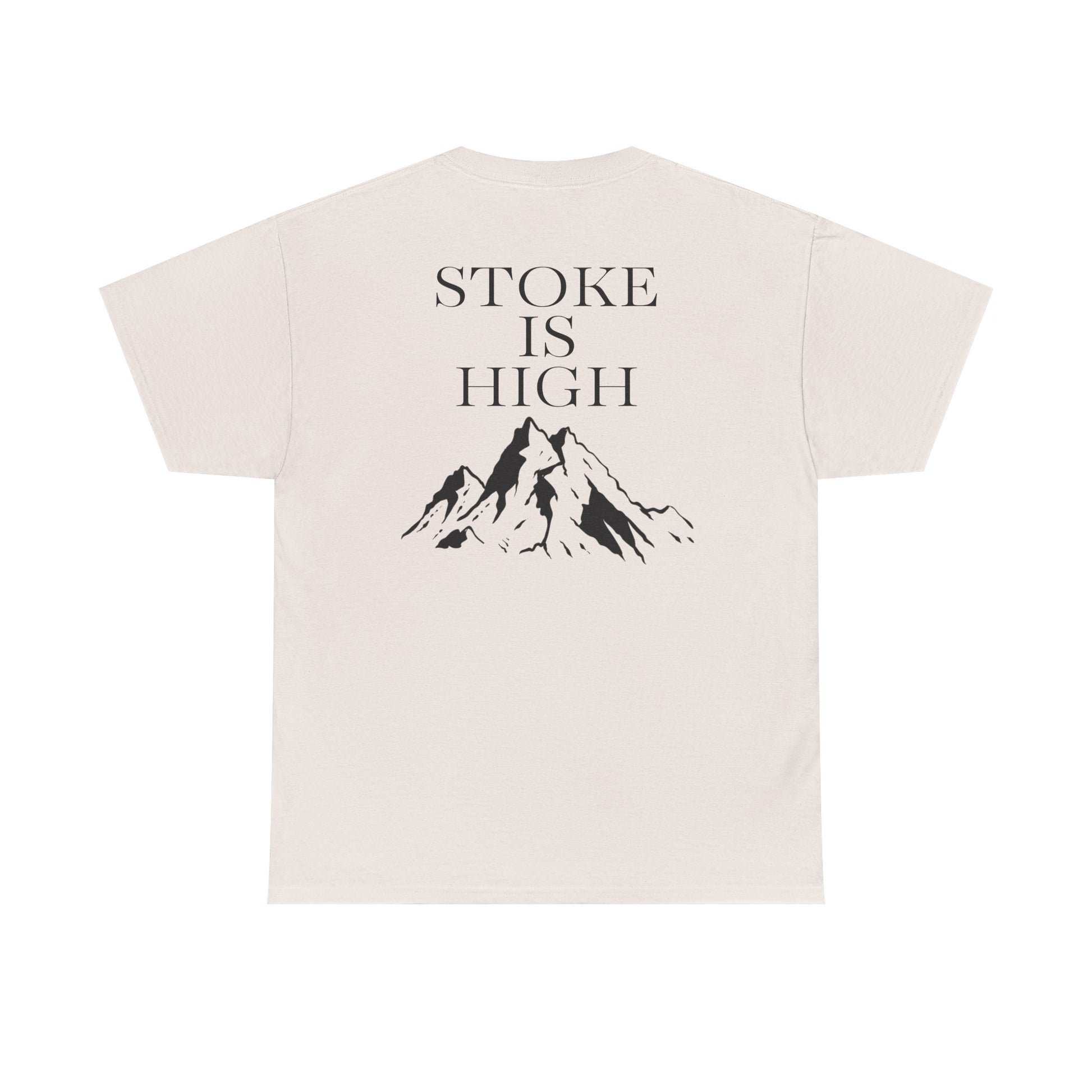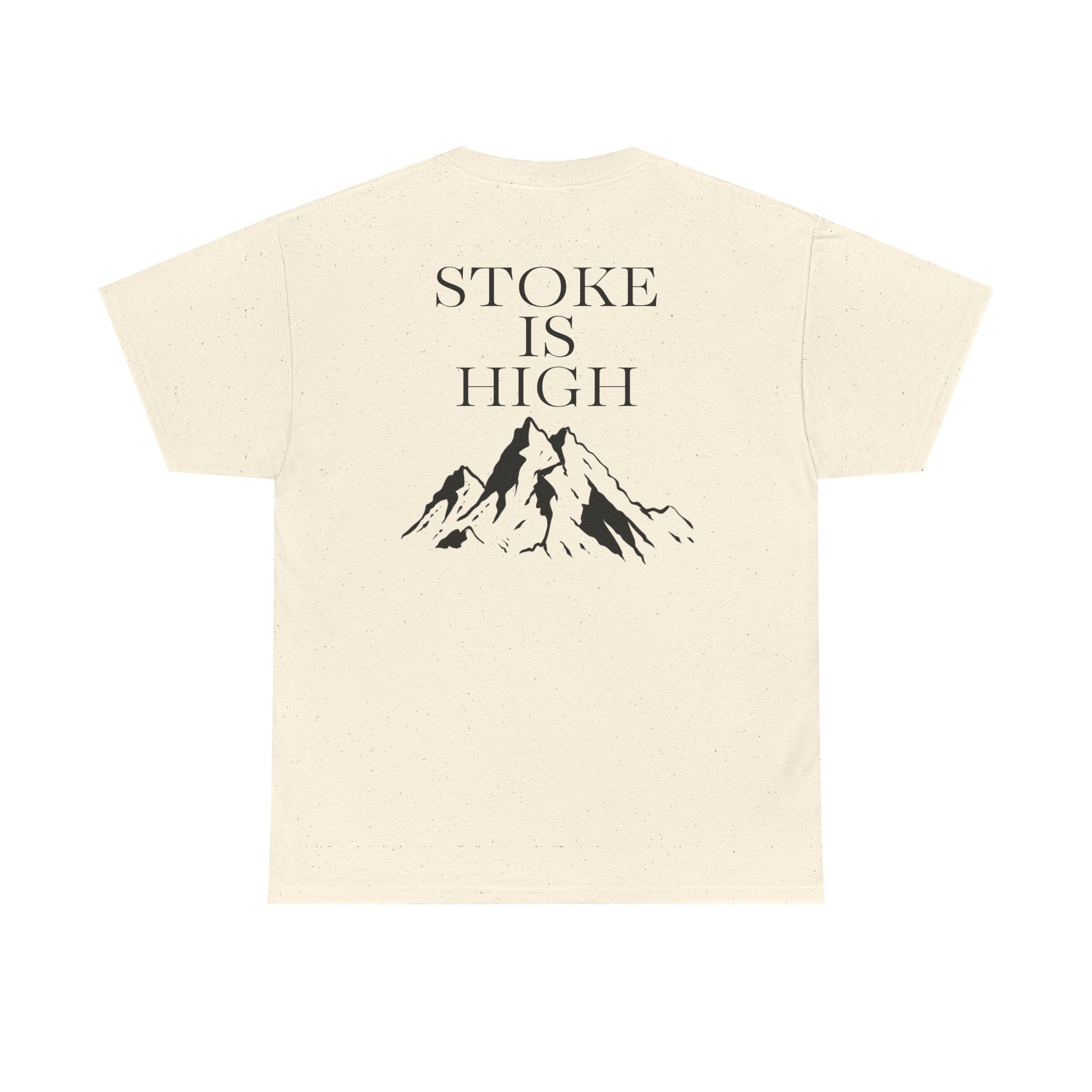 This classic crew tee celebrates the climb. The front bears a “Stoke & Trad” logo and bold back artwork of mountain peaks and the words "Stoke Is High". Wear it to a ping pong competition, tandem yoga, or sending crimp scampi. The fit sits relaxed at the shoulders and chest. The soft and smooth cotton keeps you comfortable whether you’re chalking up or grabbing a coffee after a send.
