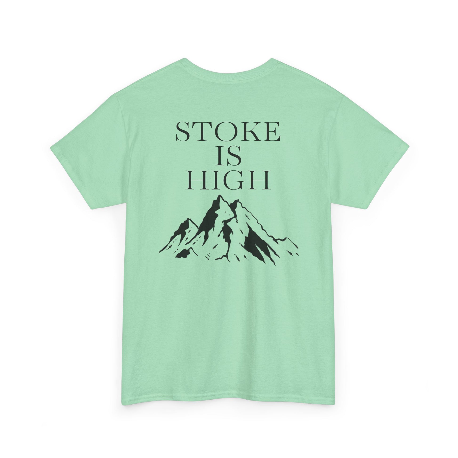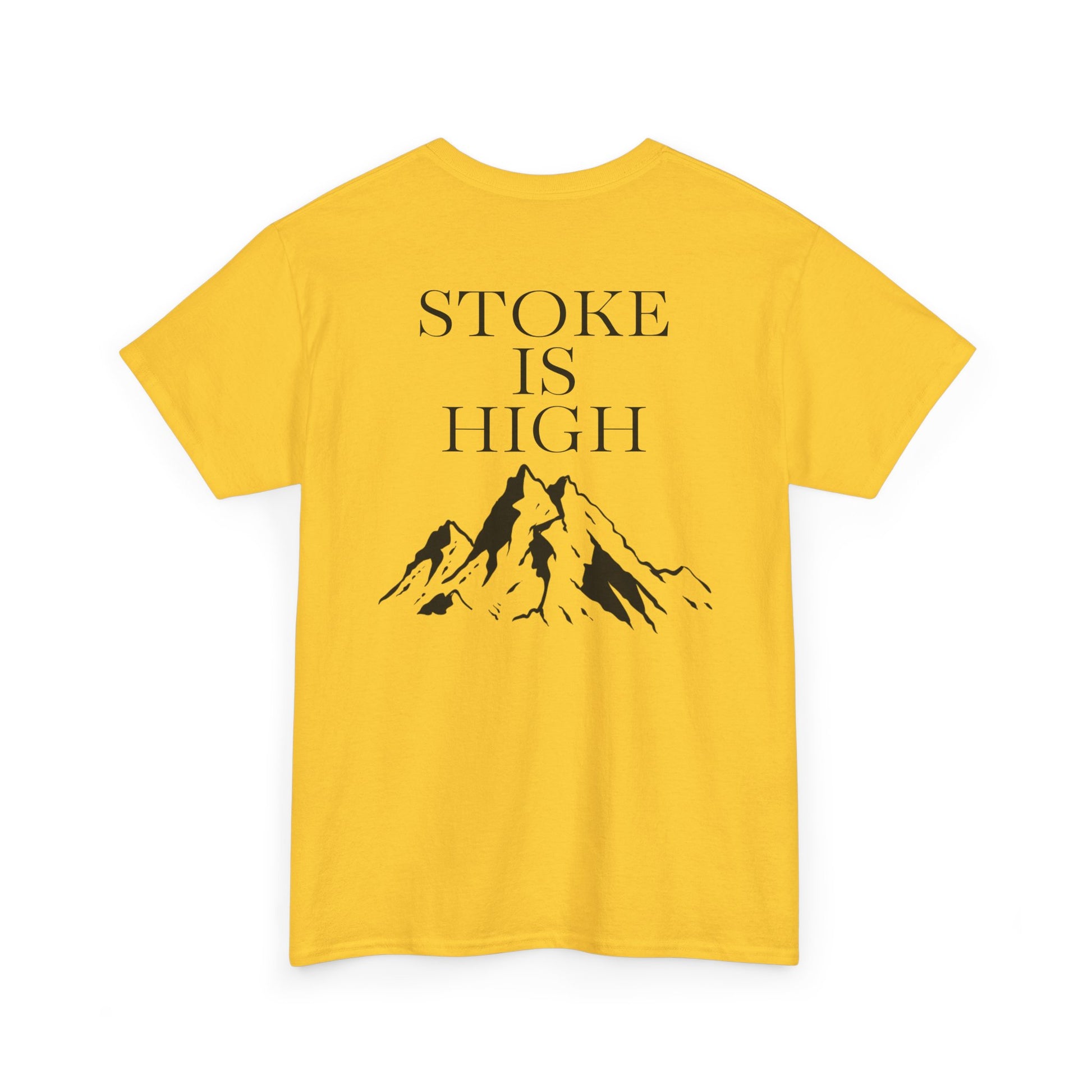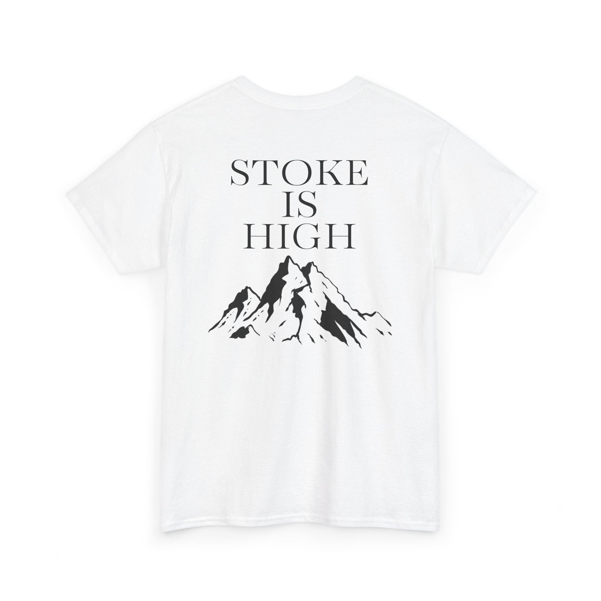 This classic crew tee celebrates the climb. The front bears a “Stoke & Trad” logo and bold back artwork of mountain peaks and the words "Stoke Is High". Wear it to a ping pong competition, tandem yoga, or sending crimp scampi. The fit sits relaxed at the shoulders and chest. The soft and smooth cotton keeps you comfortable whether you’re chalking up or grabbing a coffee after a send.