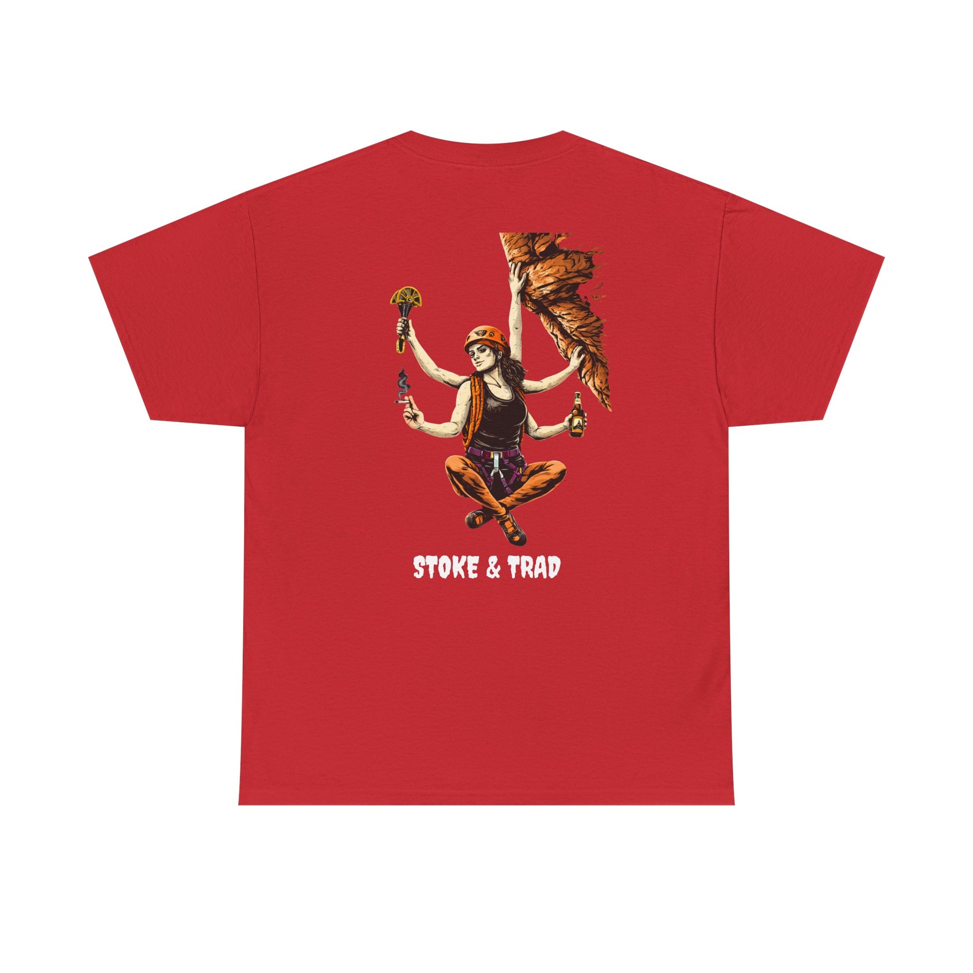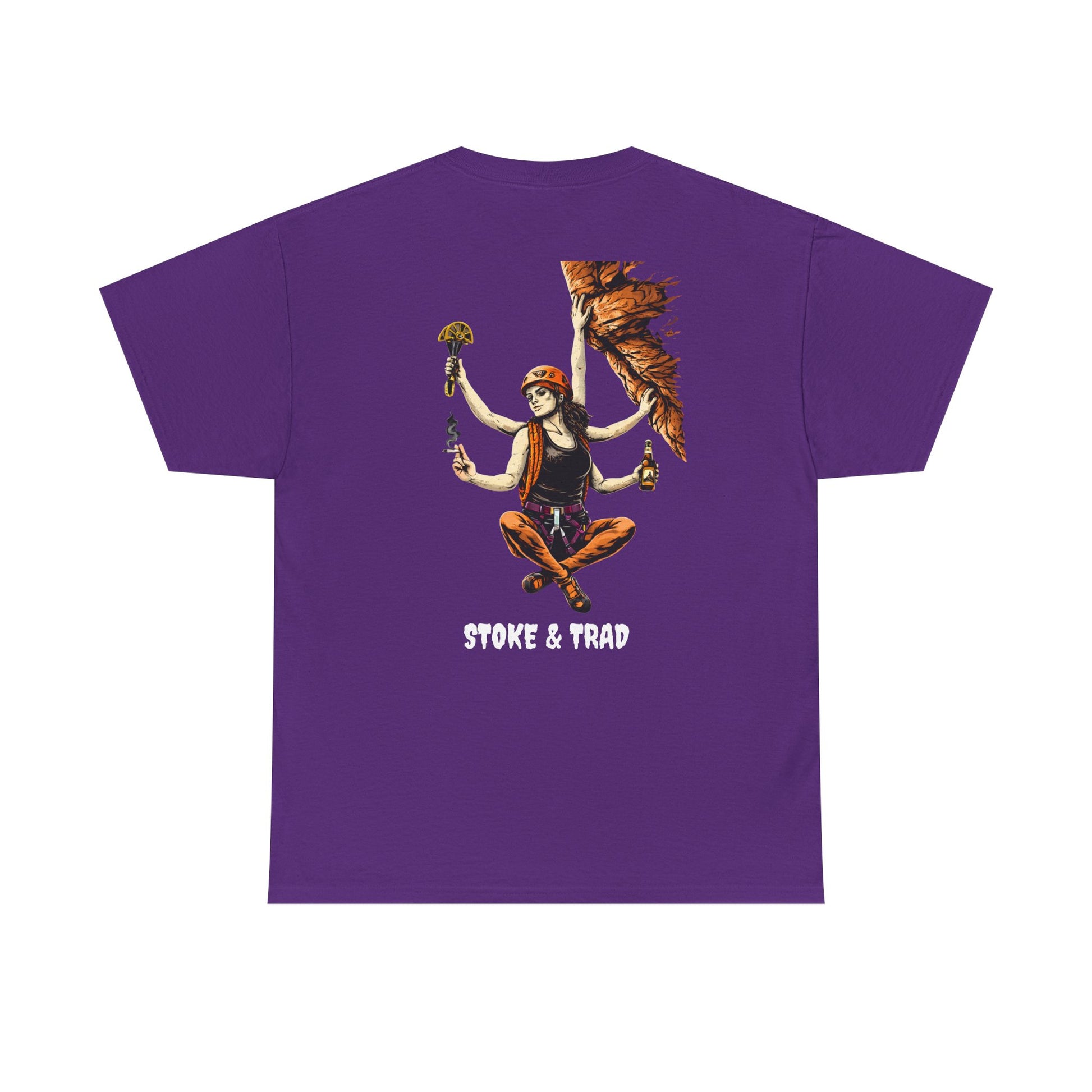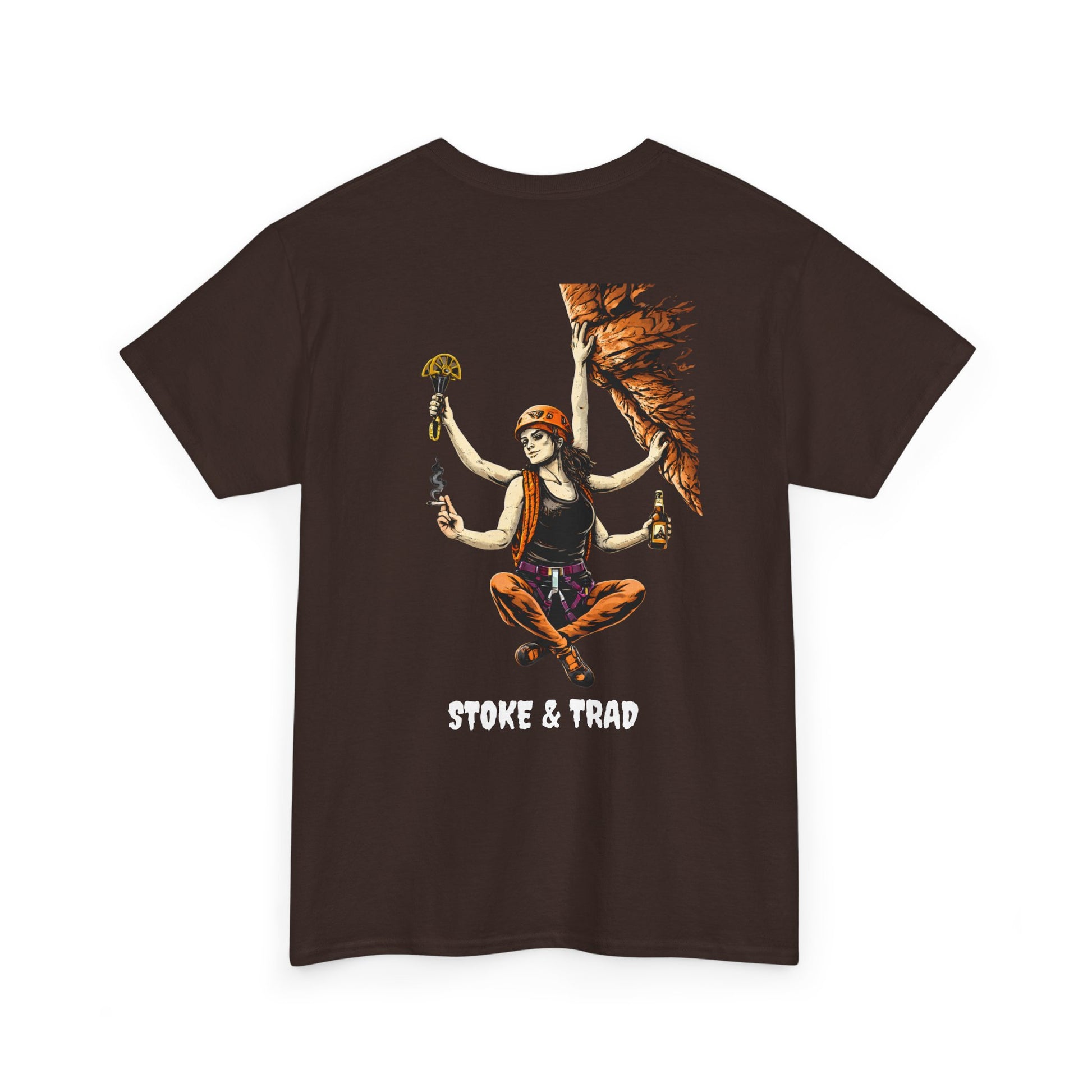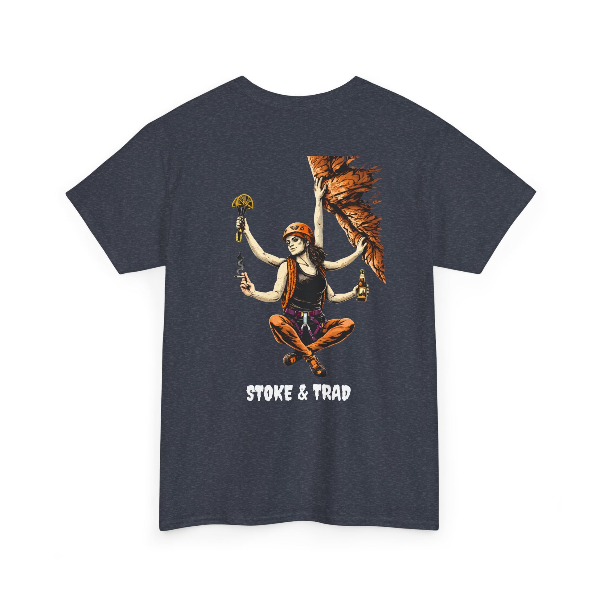 This classic crew tee celebrates the climb. The front bears a “Stoke & Trad” logo and bold back artwork of a climber holding one item of the trad trifecta in each hand. Wear it to a concert, cleaning a route, or while reading Quixote. The fit sits relaxed at the shoulders and chest. The soft and smooth cotton keeps you comfortable whether you’re chalking up or grabbing a coffee after a send.