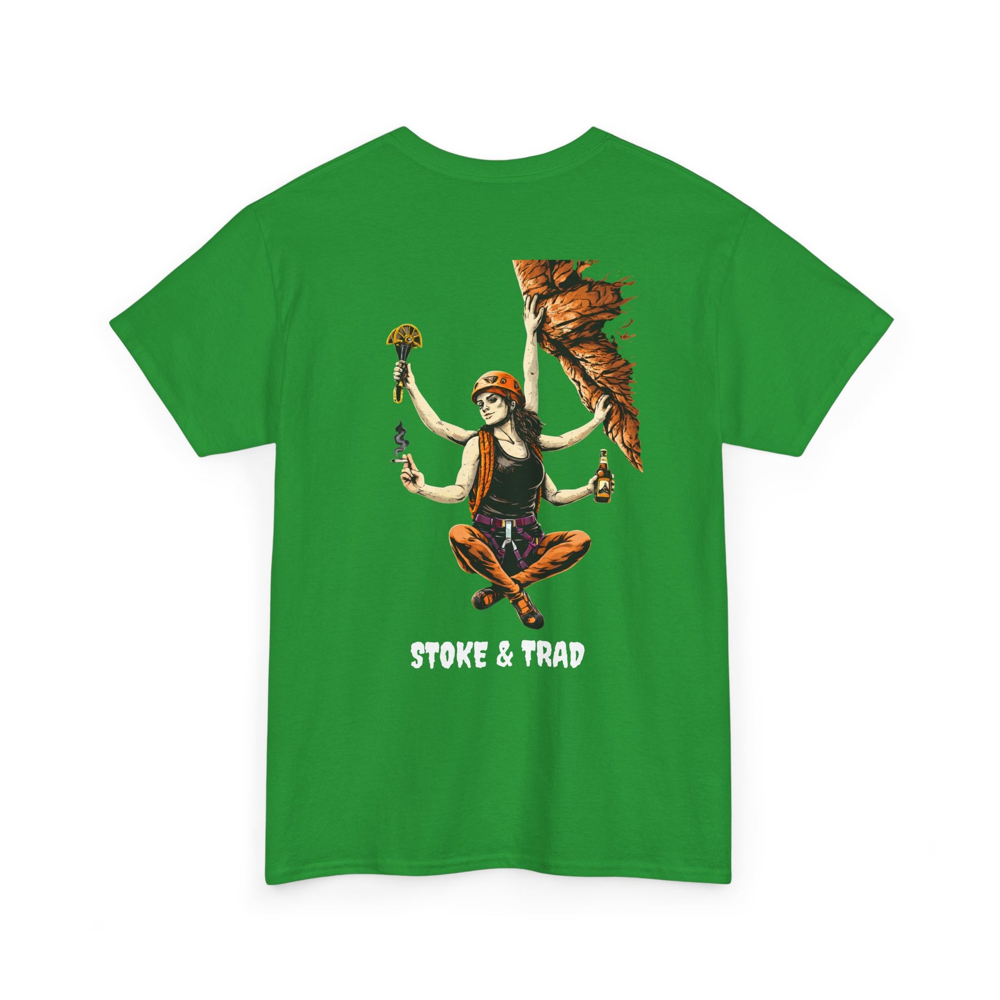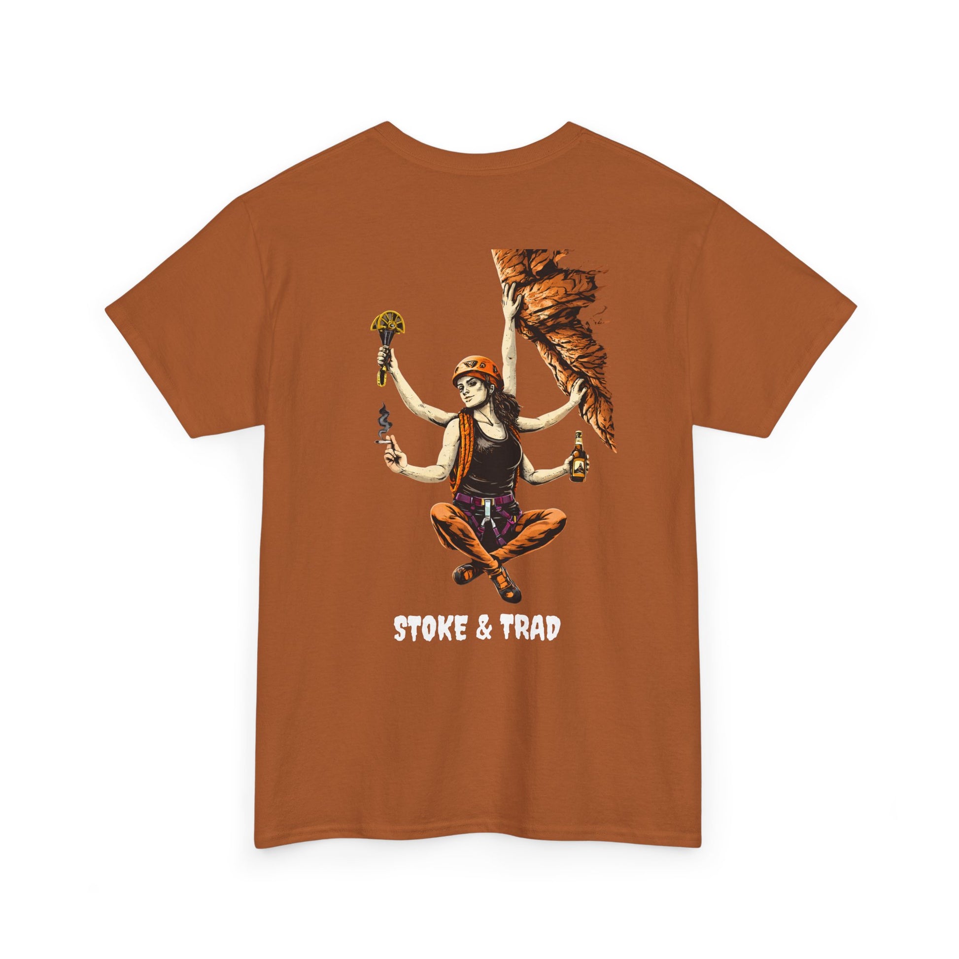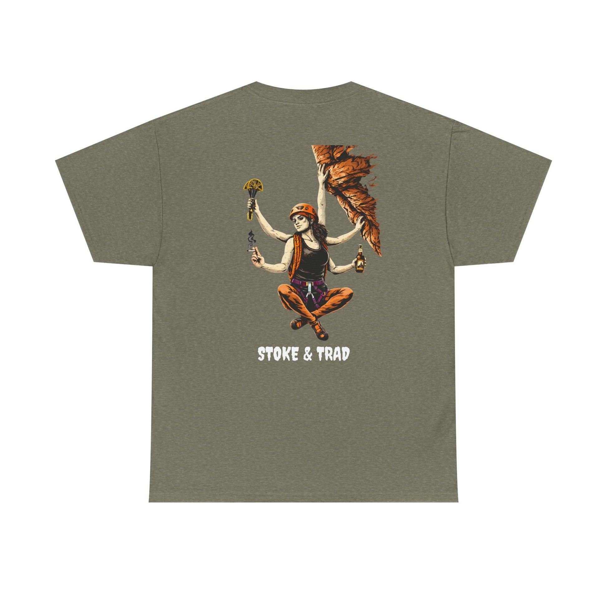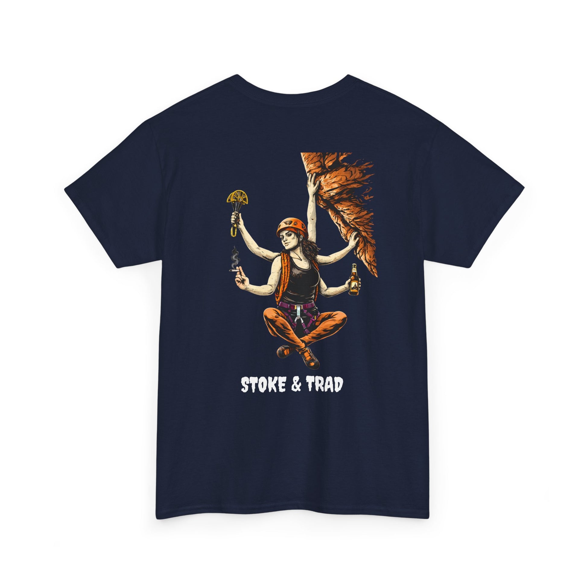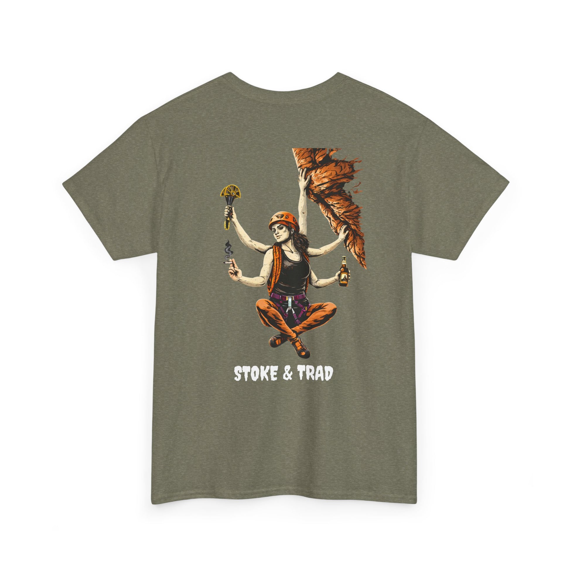 This classic crew tee celebrates the climb. The front bears a “Stoke & Trad” logo and bold back artwork of a climber holding one item of the trad trifecta in each hand. Wear it to a concert, cleaning a route, or while reading Quixote. The fit sits relaxed at the shoulders and chest. The soft and smooth cotton keeps you comfortable whether you’re chalking up or grabbing a coffee after a send.