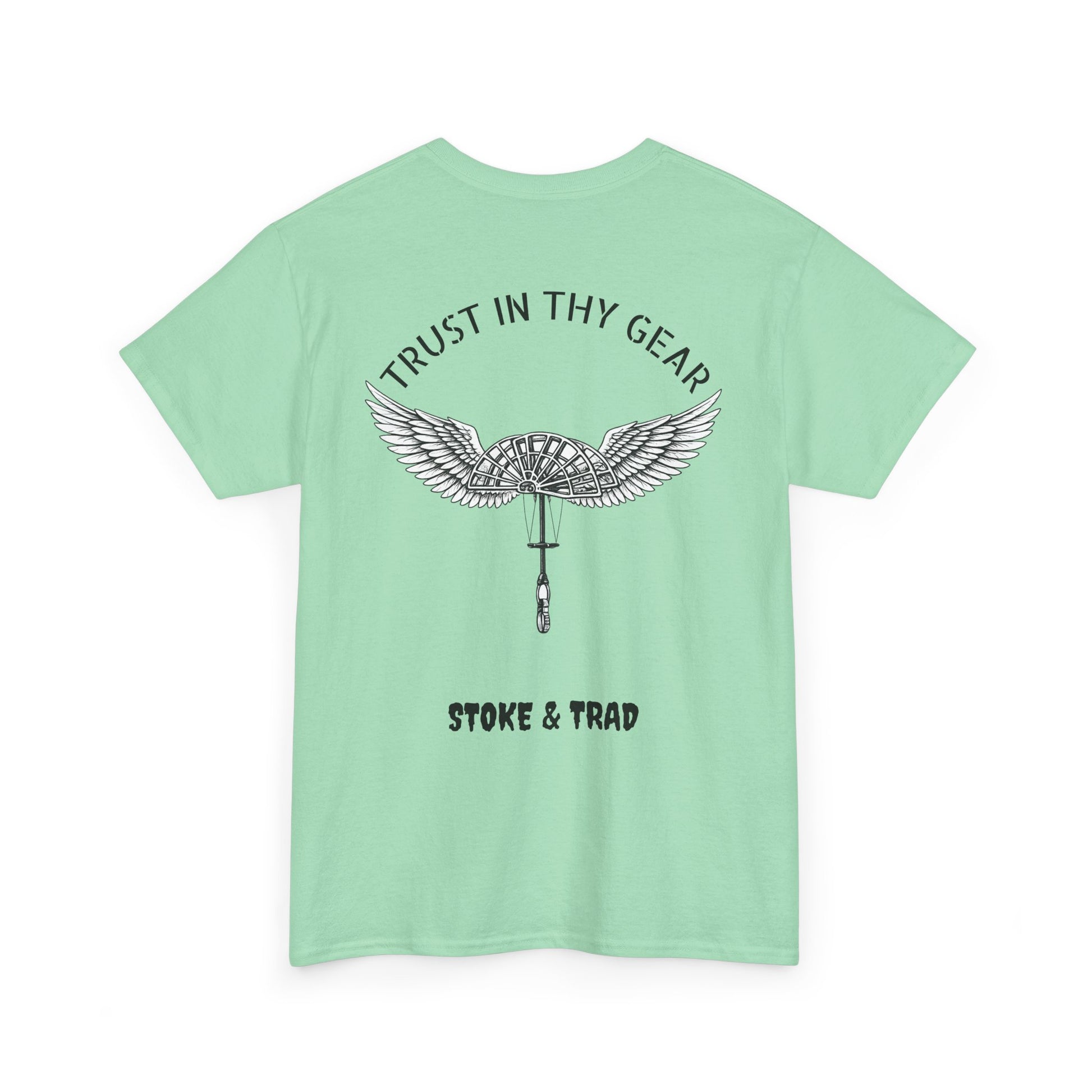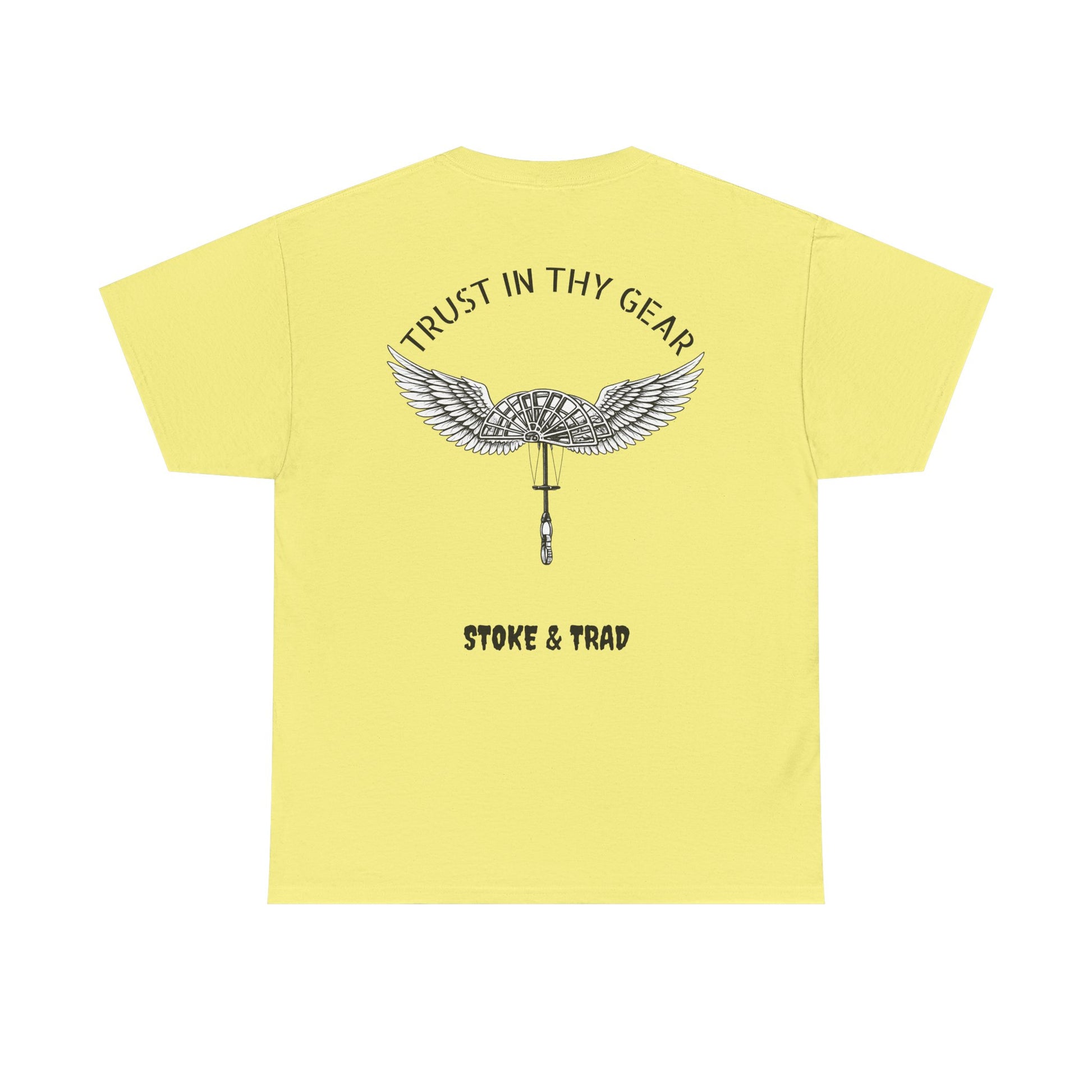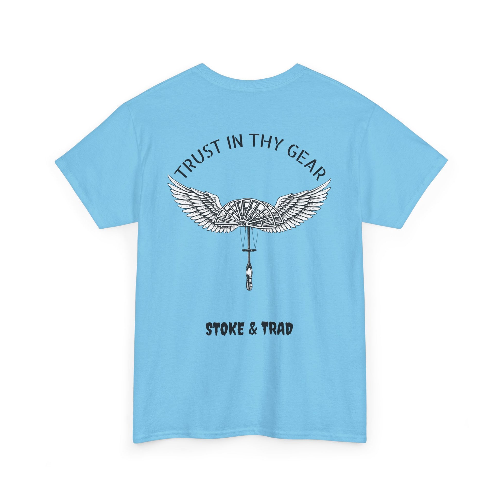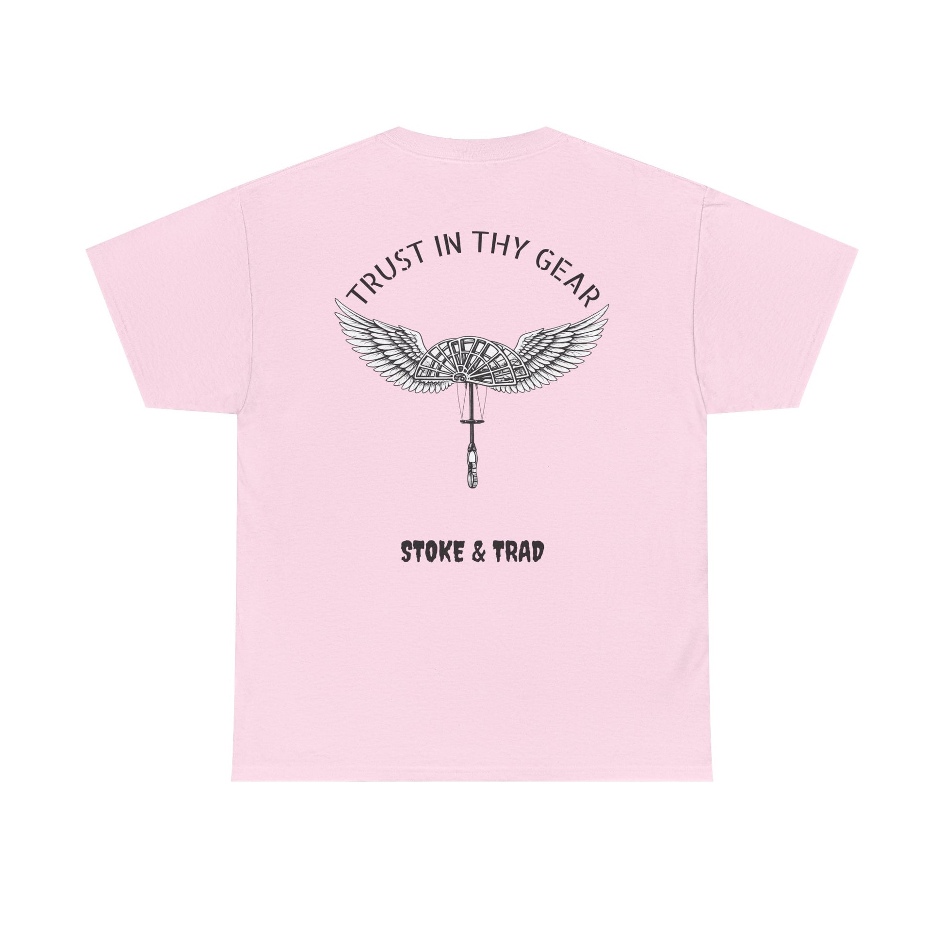 This classic crew tee celebrates the climb. The front bears a “Stoke & Trad” logo and bold back artwork of a cam with wings and the words "Trust In Thy Gear". Wear it to a climbing comp, building your home climbing wall, or showing someone your rack. The fit sits relaxed at the shoulders and chest. The soft and smooth cotton keeps you comfortable whether you’re chalking up or grabbing a coffee after a send.