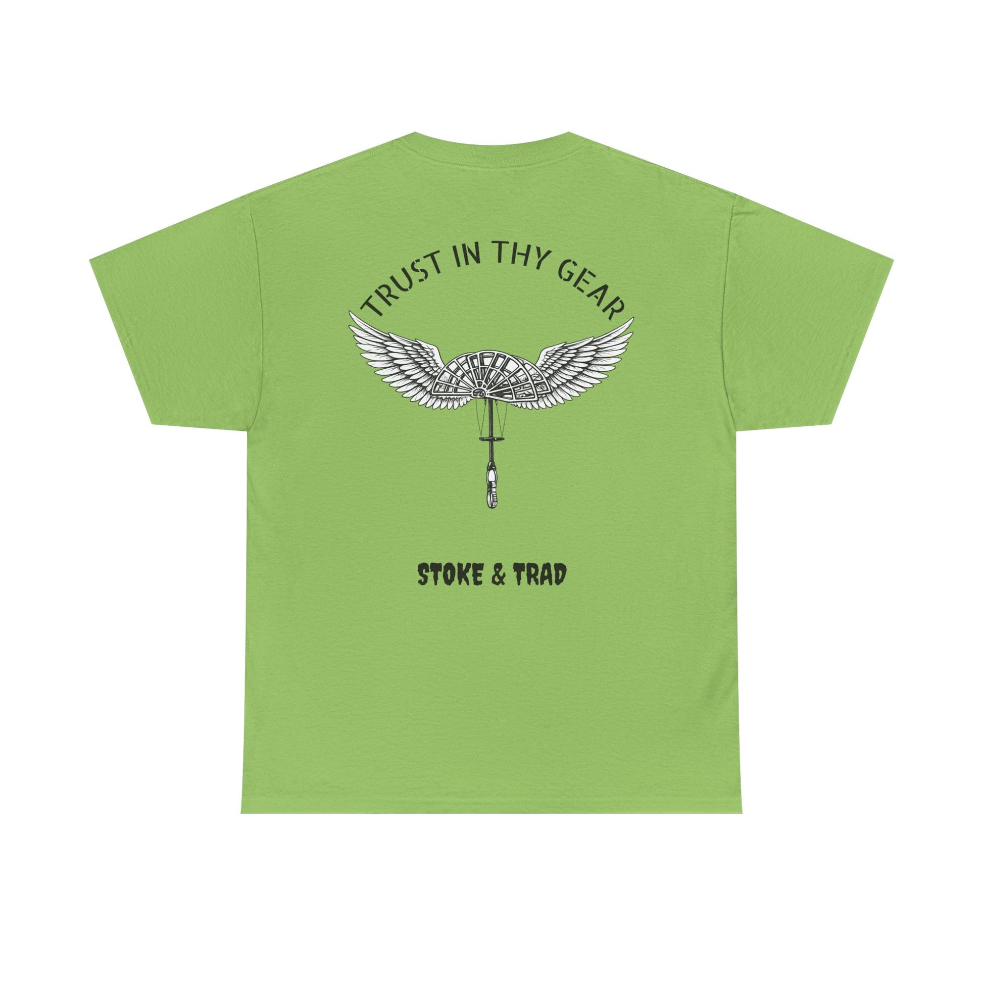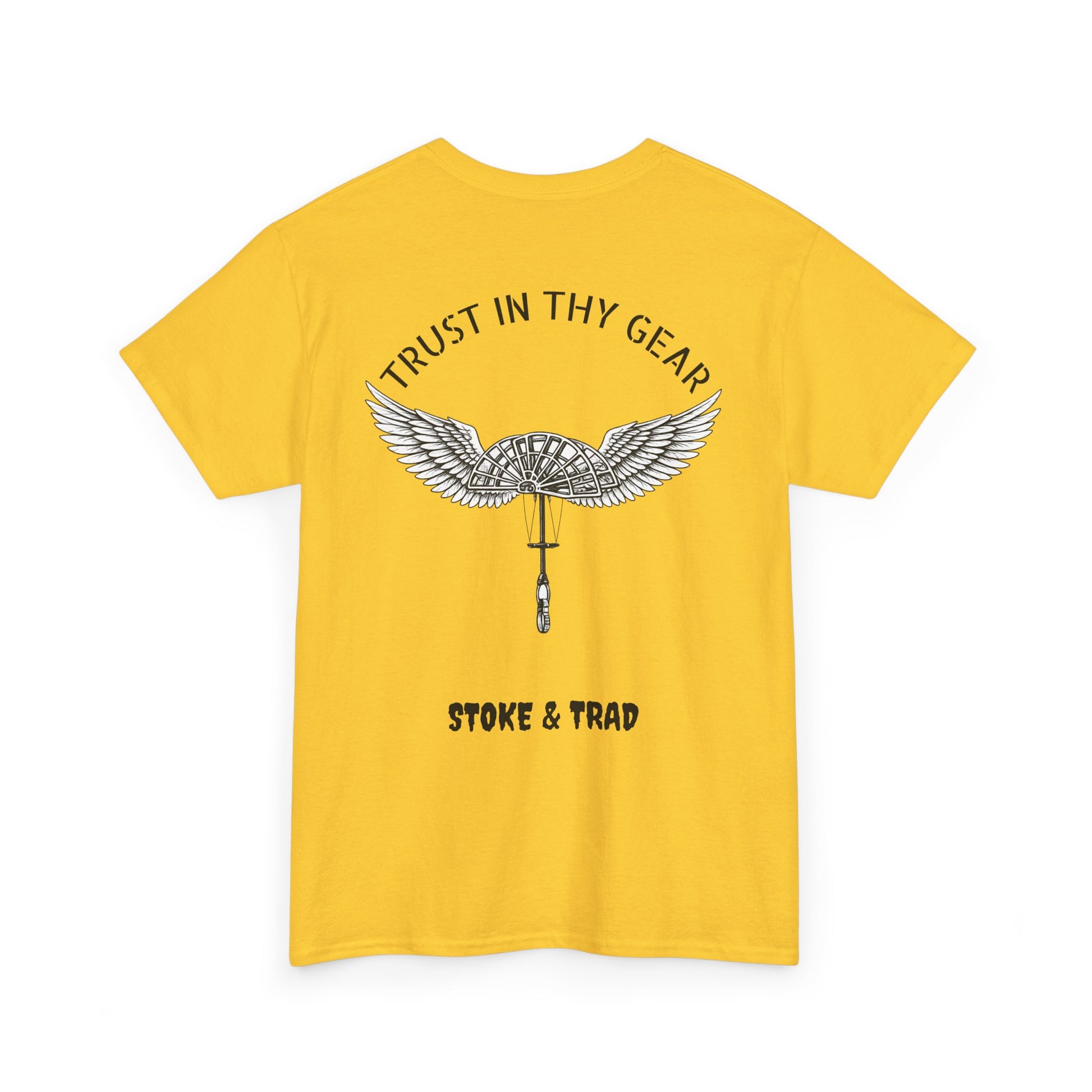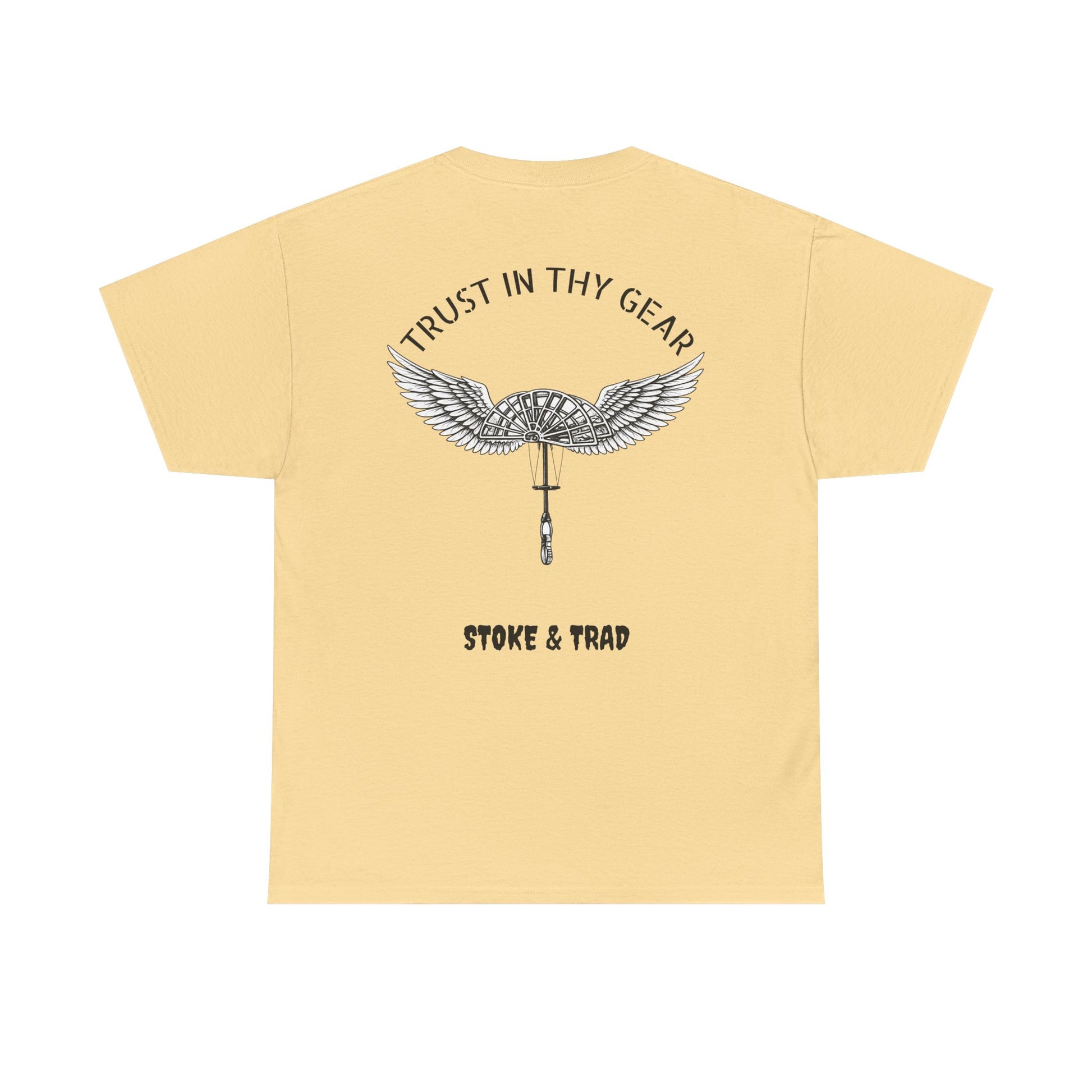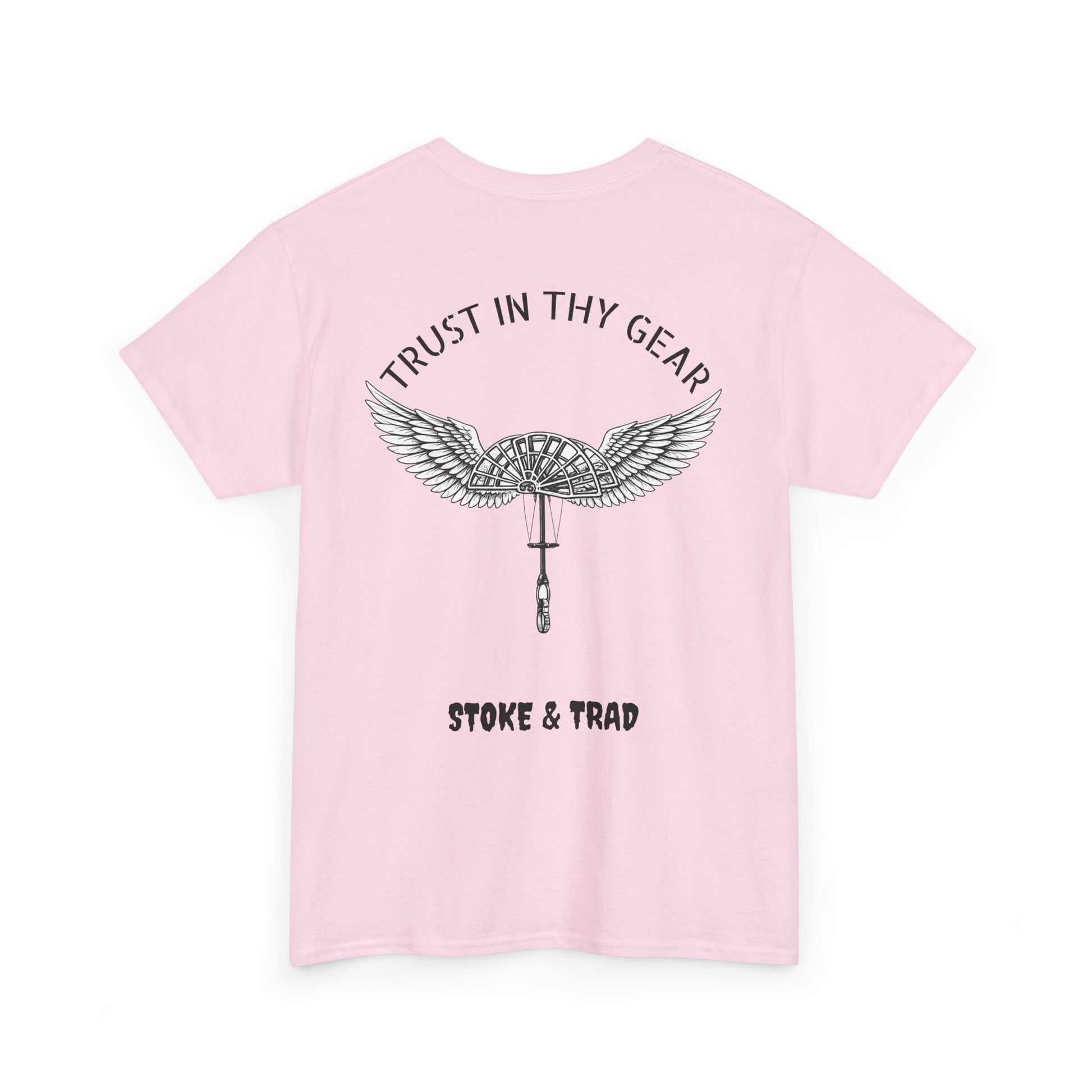 This classic crew tee celebrates the climb. The front bears a “Stoke & Trad” logo and bold back artwork of a cam with wings and the words "Trust In Thy Gear". Wear it to a climbing comp, building your home climbing wall, or showing someone your rack. The fit sits relaxed at the shoulders and chest. The soft and smooth cotton keeps you comfortable whether you’re chalking up or grabbing a coffee after a send.