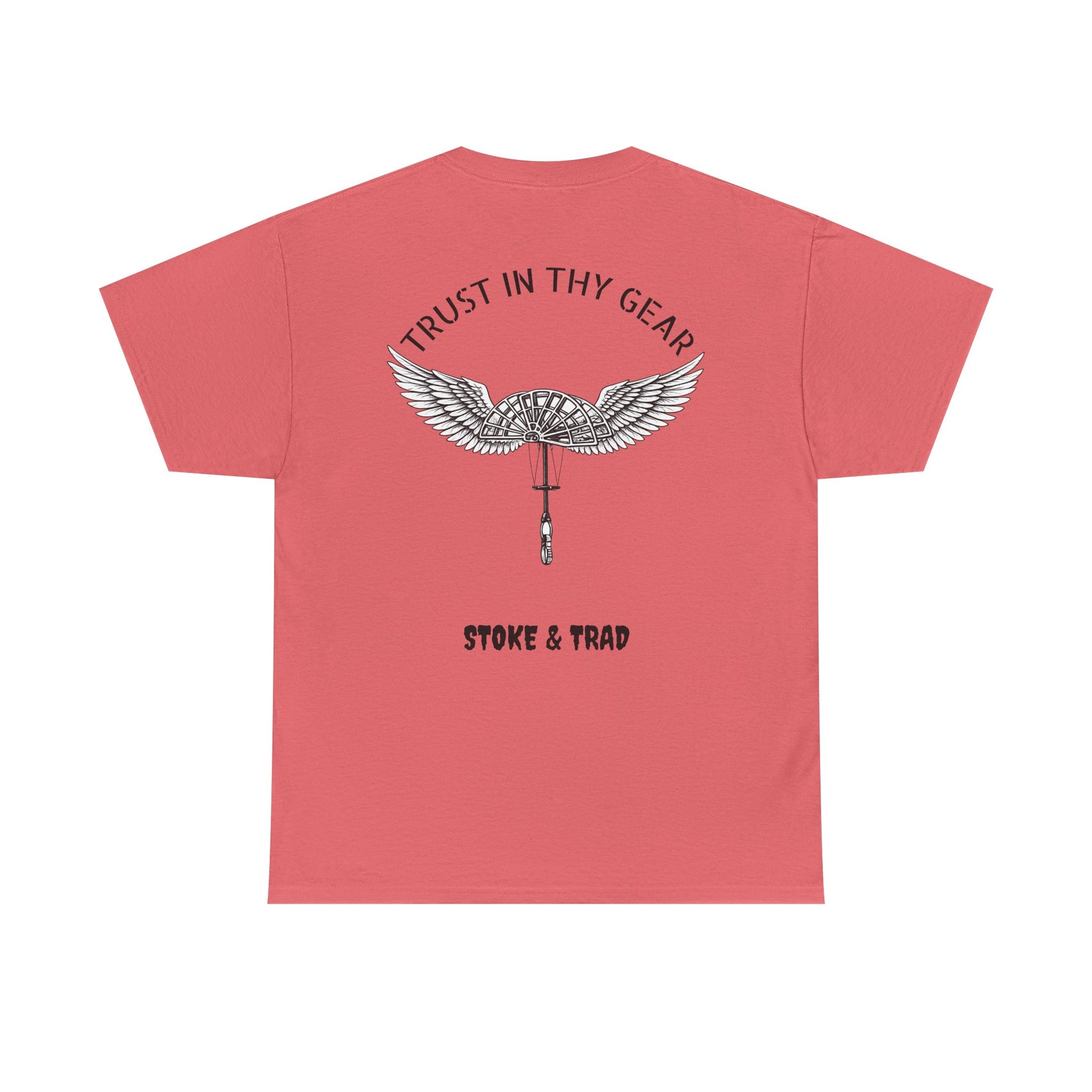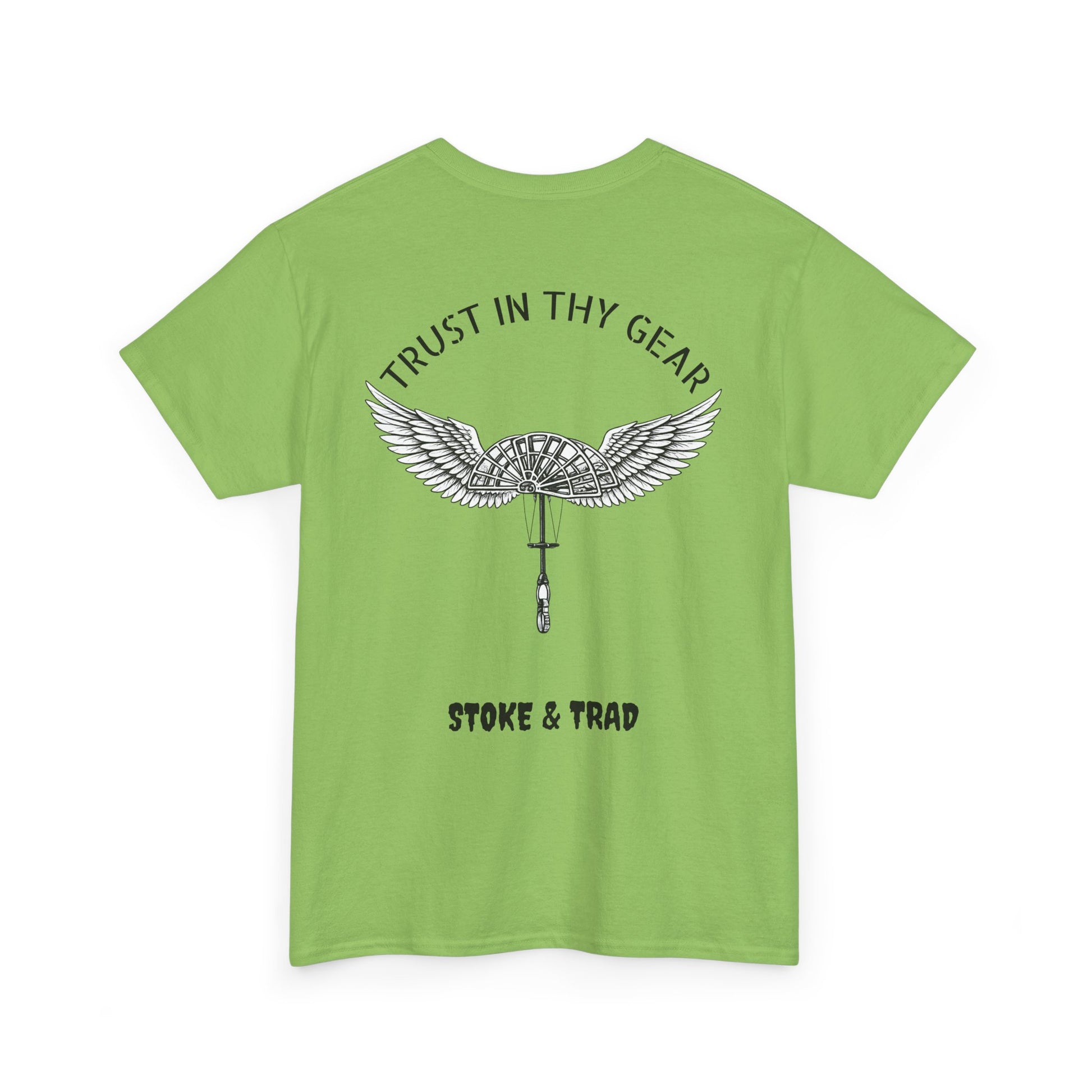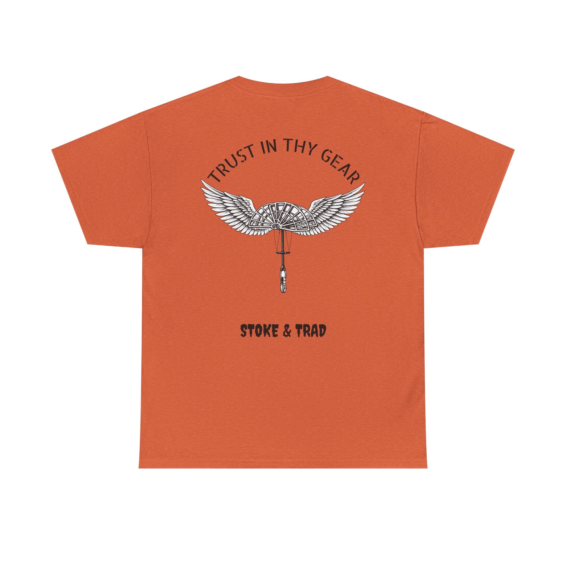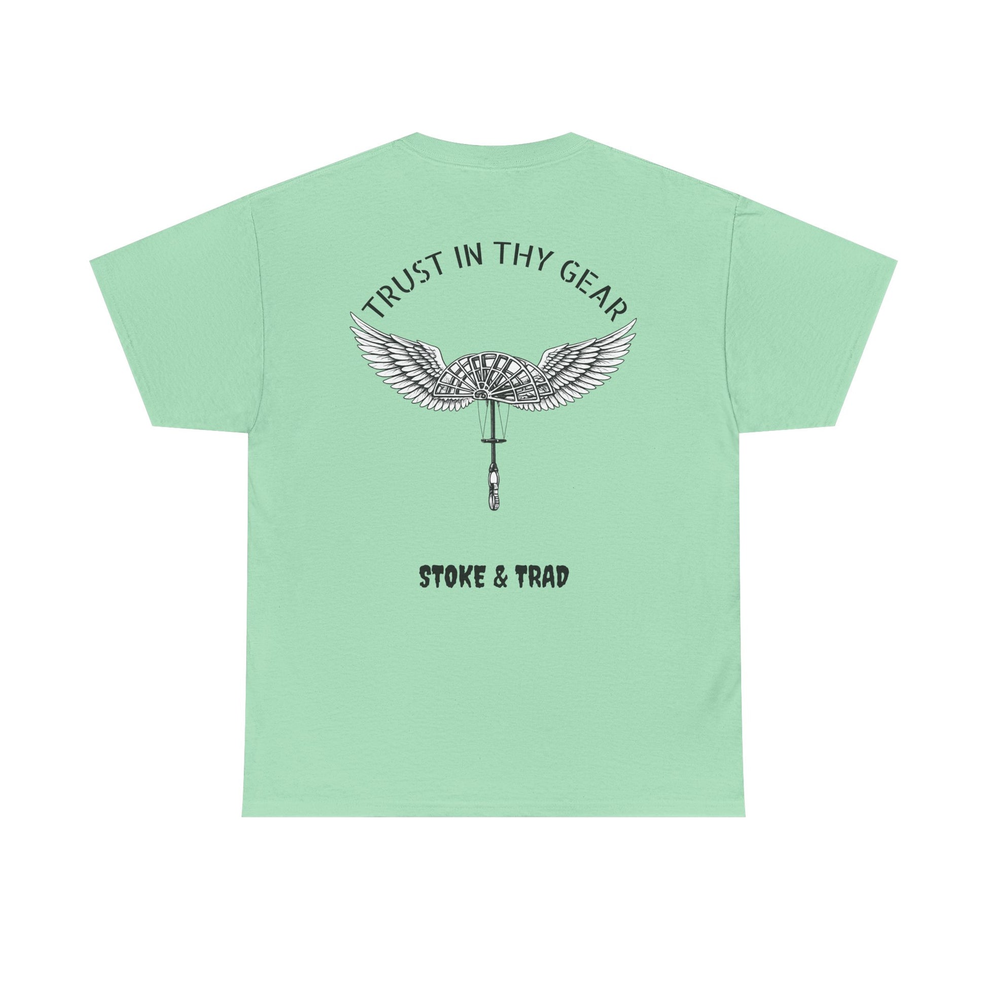 This classic crew tee celebrates the climb. The front bears a “Stoke & Trad” logo and bold back artwork of a cam with wings and the words "Trust In Thy Gear". Wear it to a climbing comp, building your home climbing wall, or showing someone your rack. The fit sits relaxed at the shoulders and chest. The soft and smooth cotton keeps you comfortable whether you’re chalking up or grabbing a coffee after a send.
